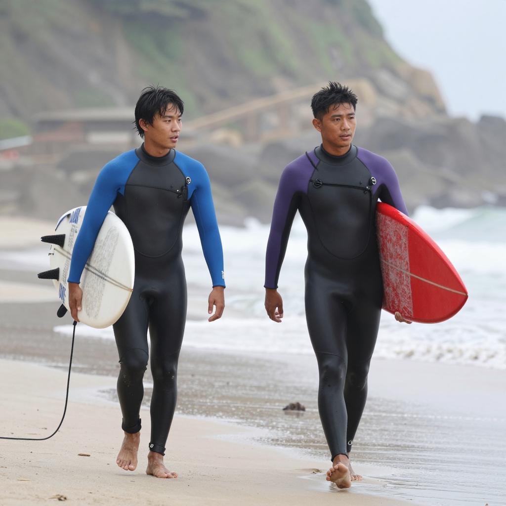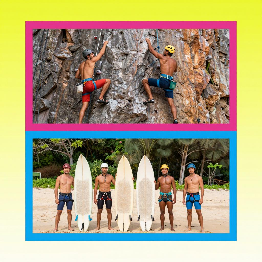 Collage of two outdoor activity scenes: the top image shows two athletic men rock climbing on a rocky cliff, wearing helmets, harnesses, and shorts, actively mid-climb. The bottom image features four shirtless men standing barefoot on a sandy beach with surfboards, wearing helmets and swim trunks, set against a backdrop of tropical trees and greenery. The collage has bright pink and blue borders on a yellow gradient background.