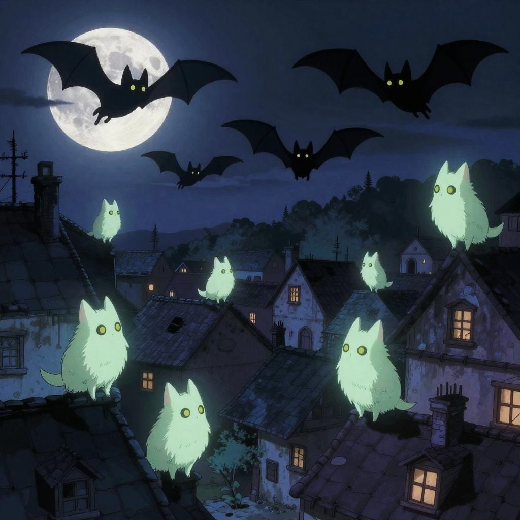 A coven of mysterious moonlight bats, each with soft glowing fur and twinkling eyes, causing eerie shadows to dance on ancient rooftops, in a sleepy village under a full moon, drawn in the whimsical and spooky anime style of Shigeru Mizuki.