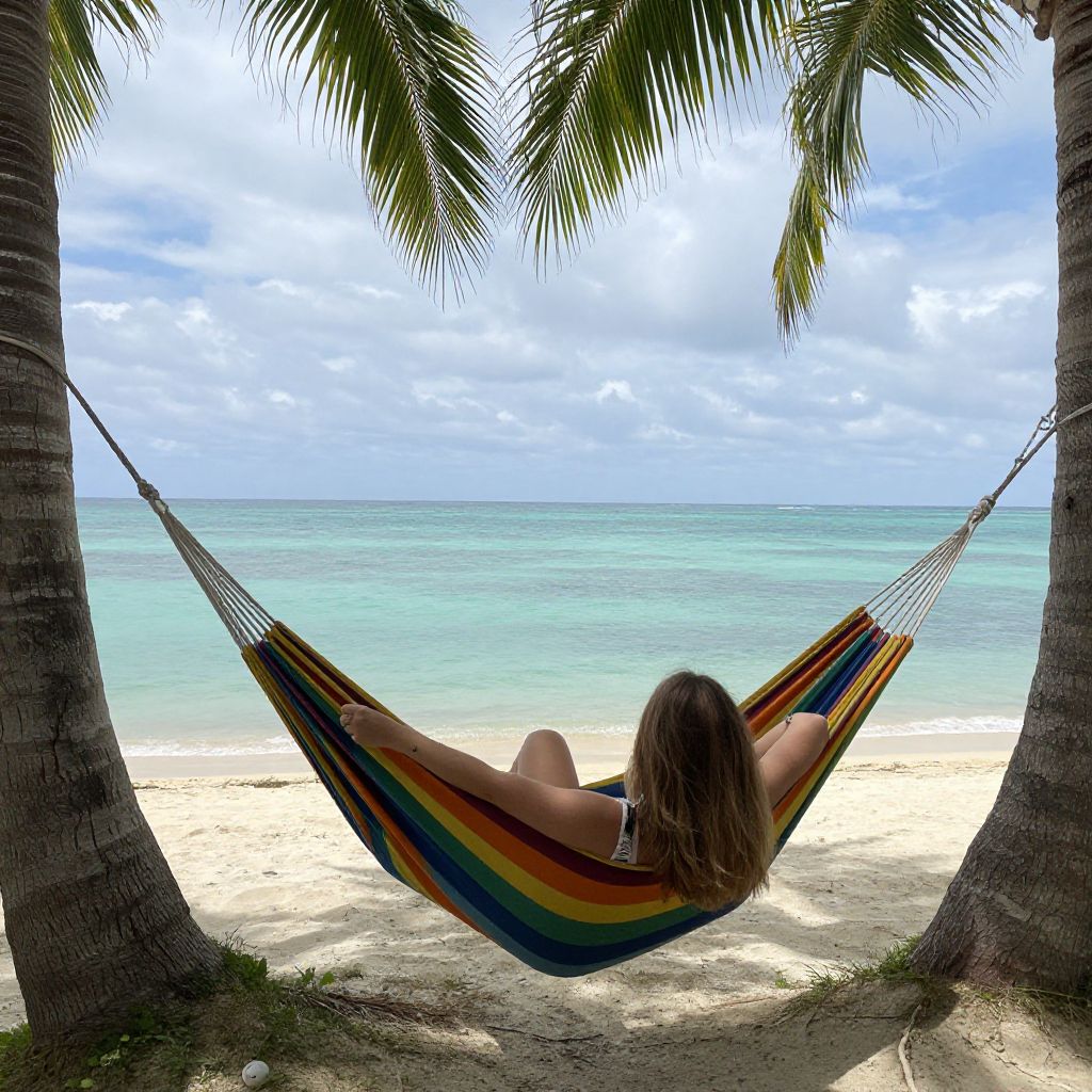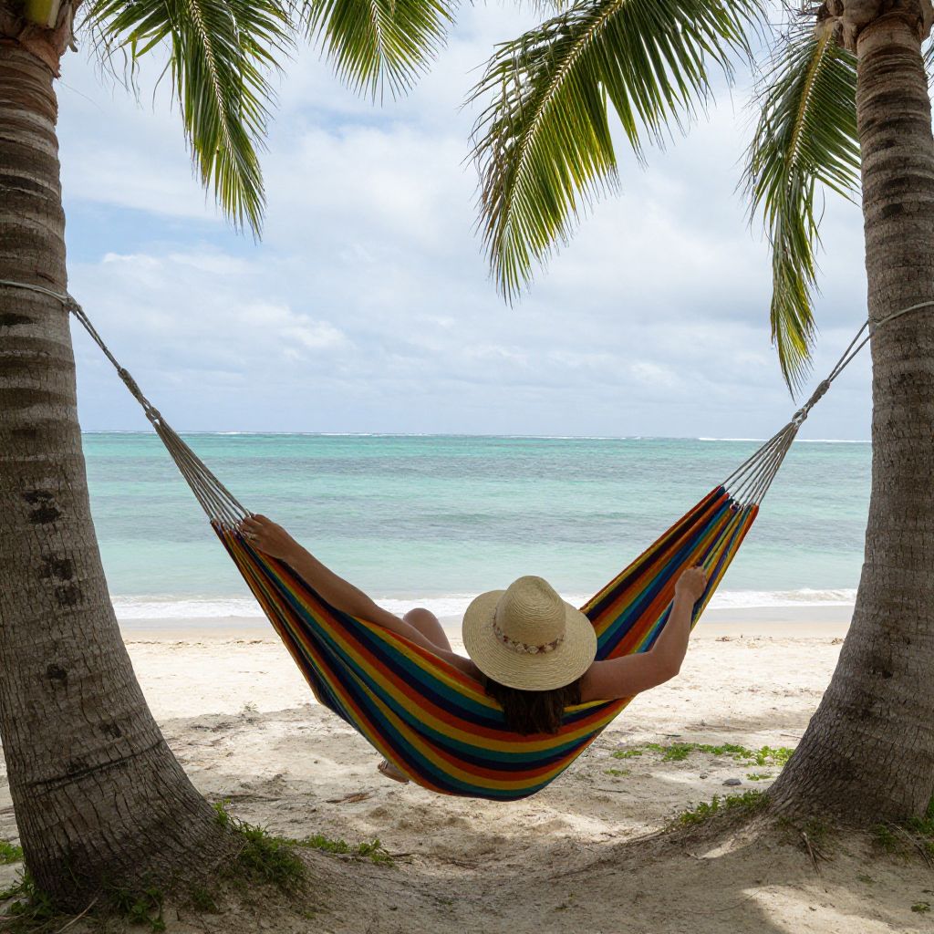 Woman relaxing in a vibrant rainbow-striped hammock suspended between two palm trees, enjoying the serene view of turquoise ocean waters and a partly cloudy sky above.