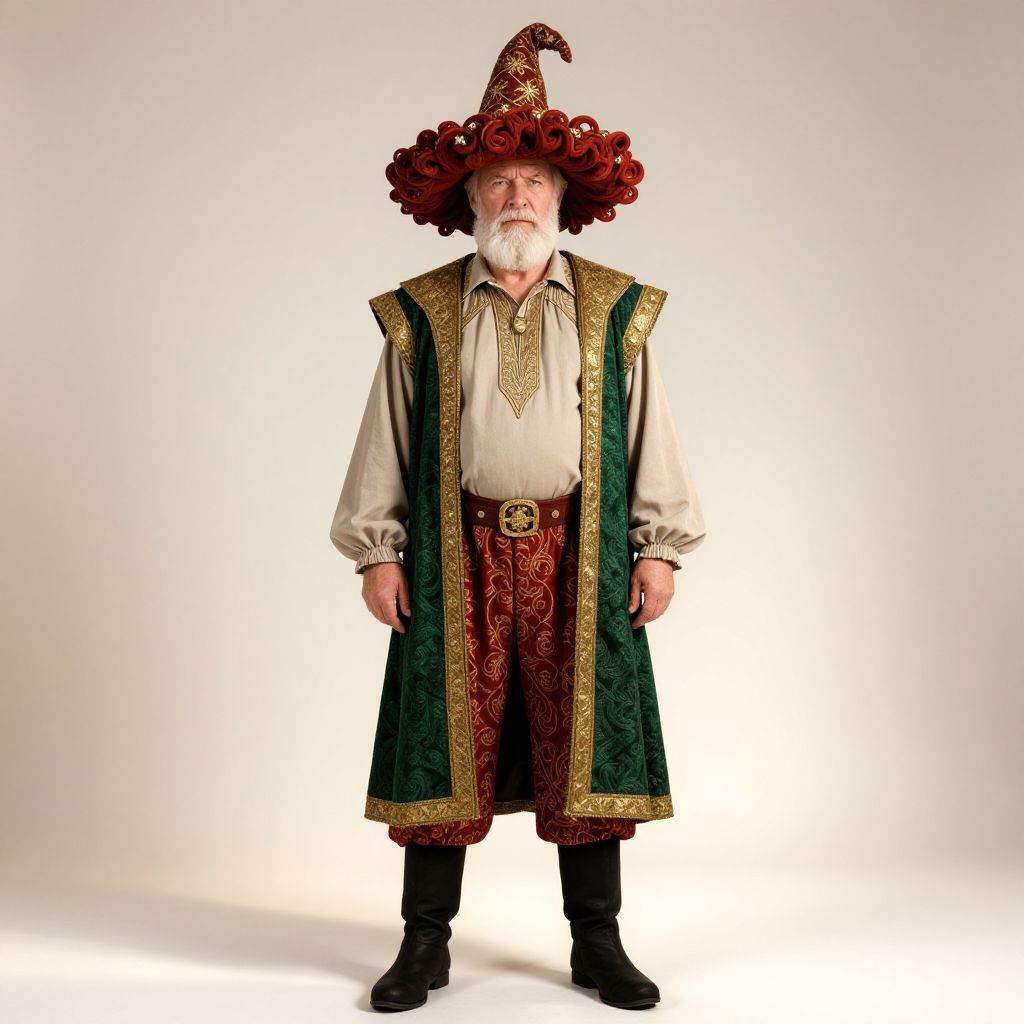 Photograph of an elderly man with a long, white beard and long, gray hair, wearing a dark brown, knee-length medieval-style tunic with a belt, and black boots. He stands against a plain, beige fabric backdrop, looking serious with his hands by his sides. The lighting is bright, highlighting his face and the texture of his tunic.