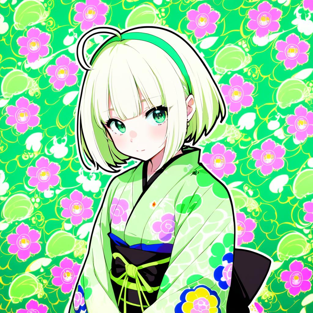 Moriyama shiemi, ao no exorcist, 1girl, green eyes, blonde hair, short hair, ahoge, hairband, kimono, by artist metata, anime