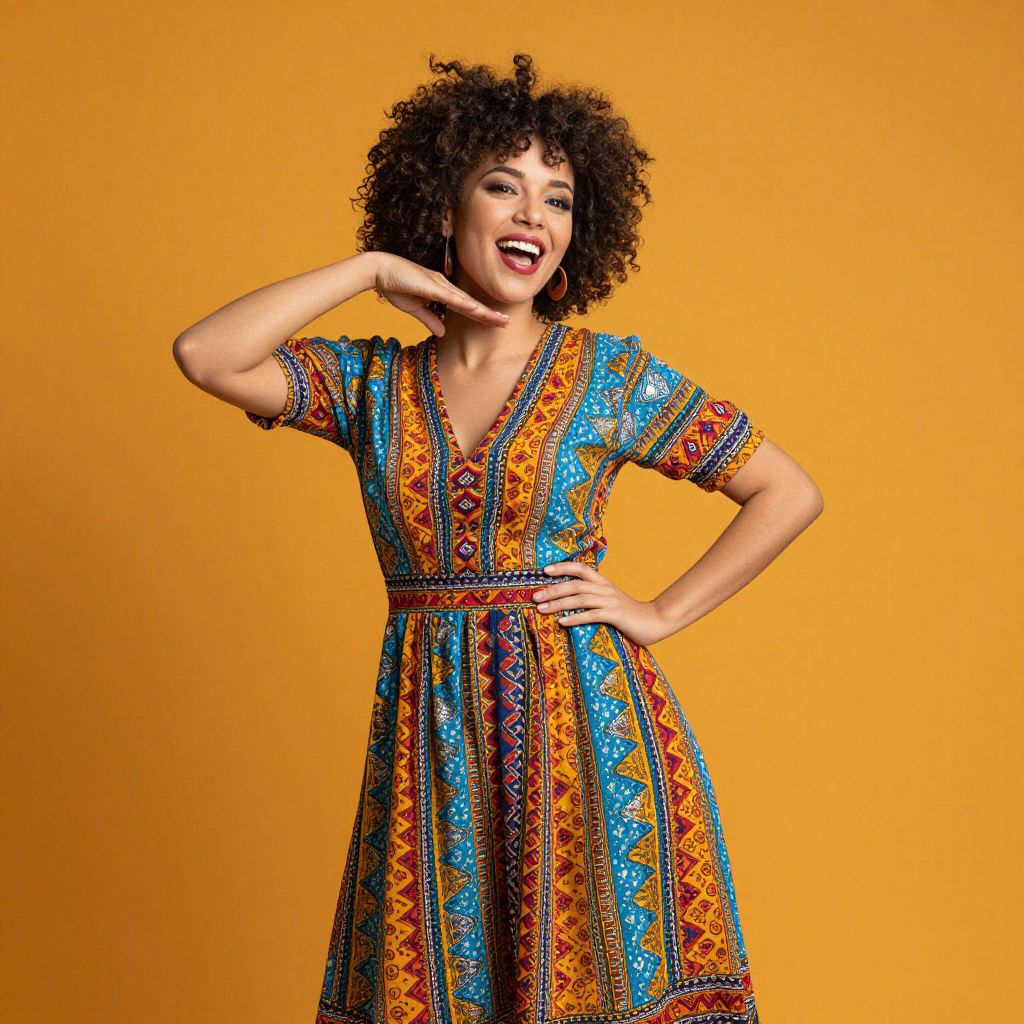 A joyful woman with curly hair poses playfully in a vibrant, colorful dress. The warm hues of her outfit complement the vivid background, capturing a sense of culture and positivity. This image radiates a cheerful and lively atmosphere, perfect for conveying themes of happiness and celebration.