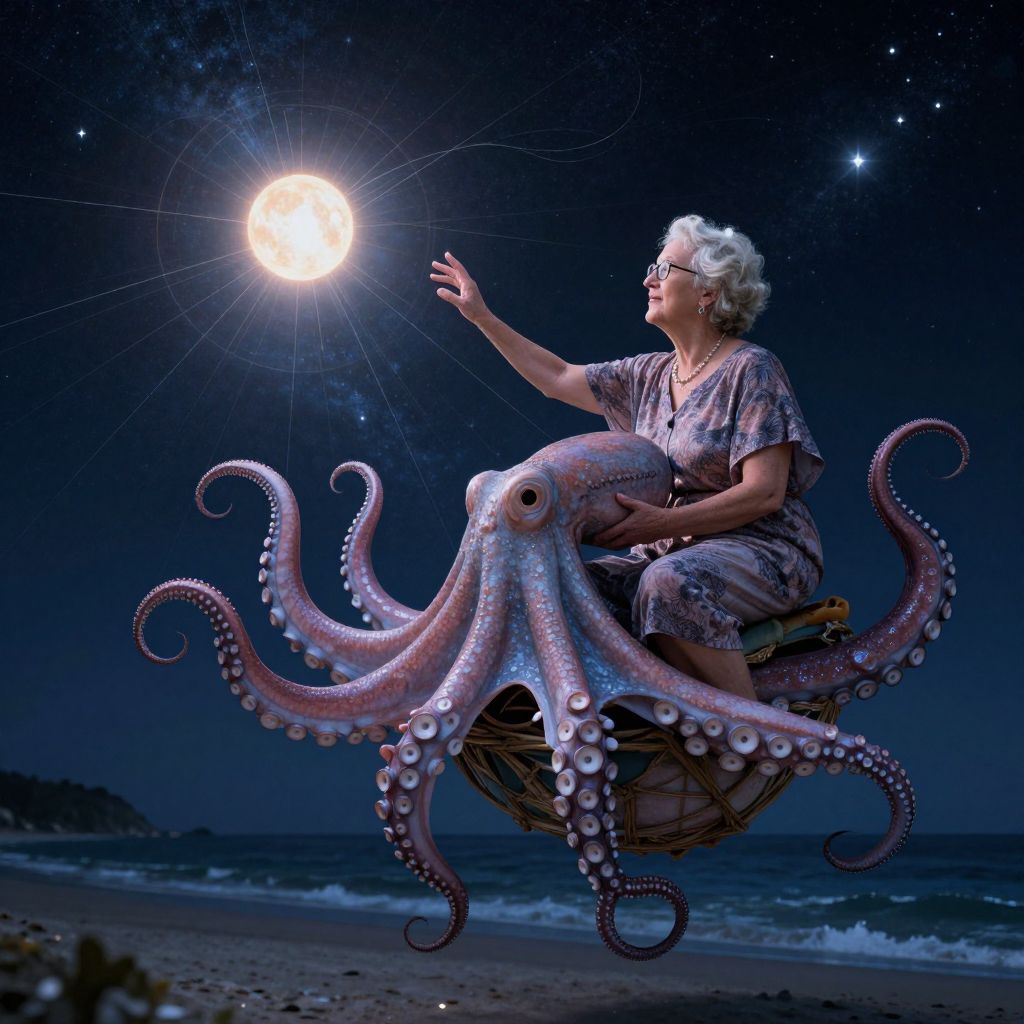 Elderly woman sits gracefully atop a levitating octopus, its tentacles adorned with suction cups, as she reaches out toward a radiant celestial display, her song weaving luminous paths through the starlit night sky above a distant shoreline.