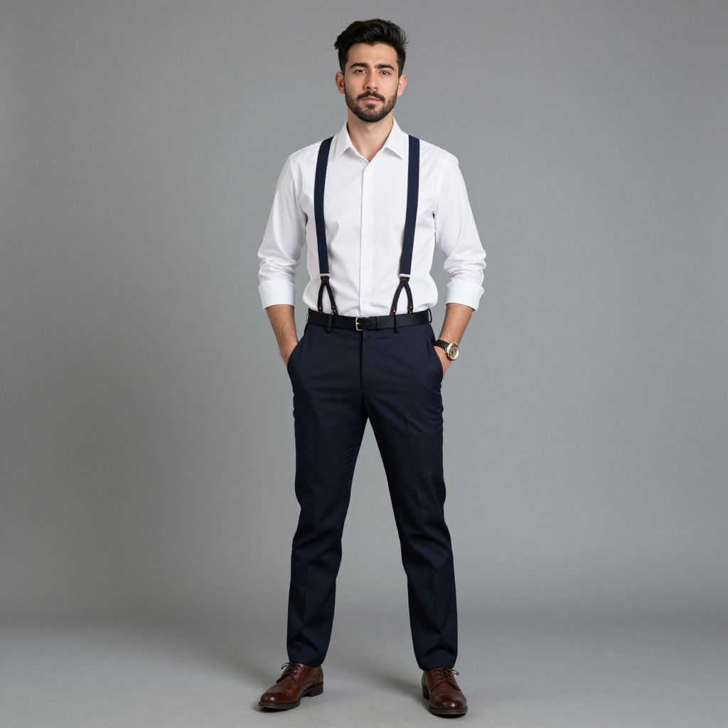 "man myers costume, 1boy, male focus, solo, facial hair, beard, suspenders, watch, wristwatch, pants, shirt, black hair, belt, hands in pockets, standing, brown footwear, mustache, full body"