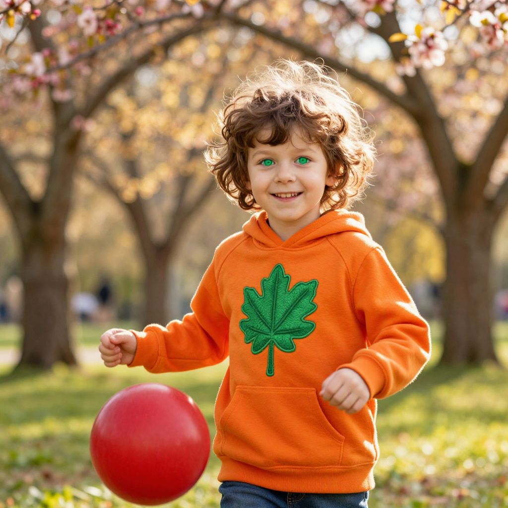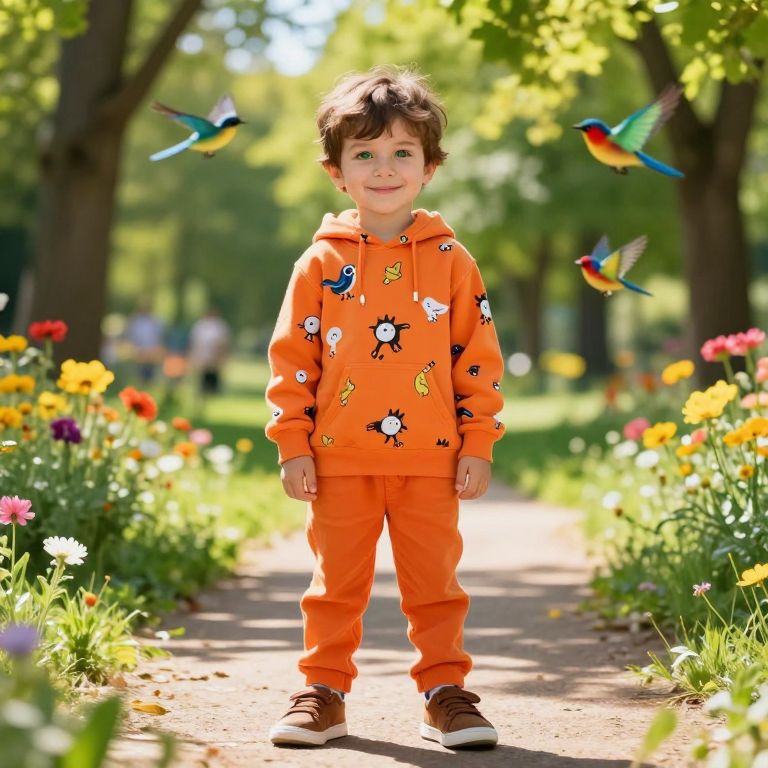 A lively boy wearing a colorful watermelon-themed outfit, with orange pants and a green hoodie that features a watermelon pattern, standing in a sunny backyard with a bright background of green grass and flowers, smiling confidently with his arms spread, as if enjoying the summer day. The scene is vibrant and playful, capturing a sense of fun and energy.