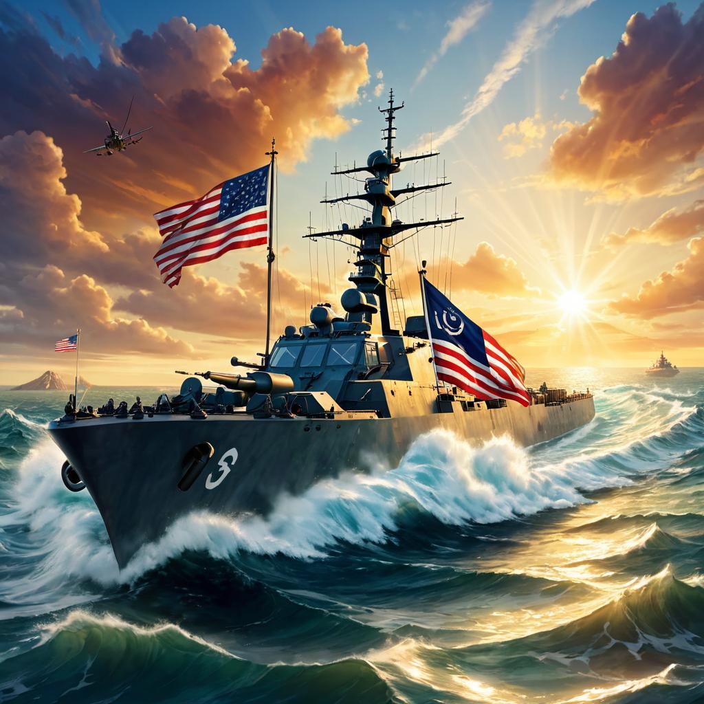 No humans, watercraft, ship, flag, ocean, cloud, sky, water, military vehicle, outdoors, warship, sunset, military, scenery, sunburst, cloudy sky, waves, vehicle focus, anchor