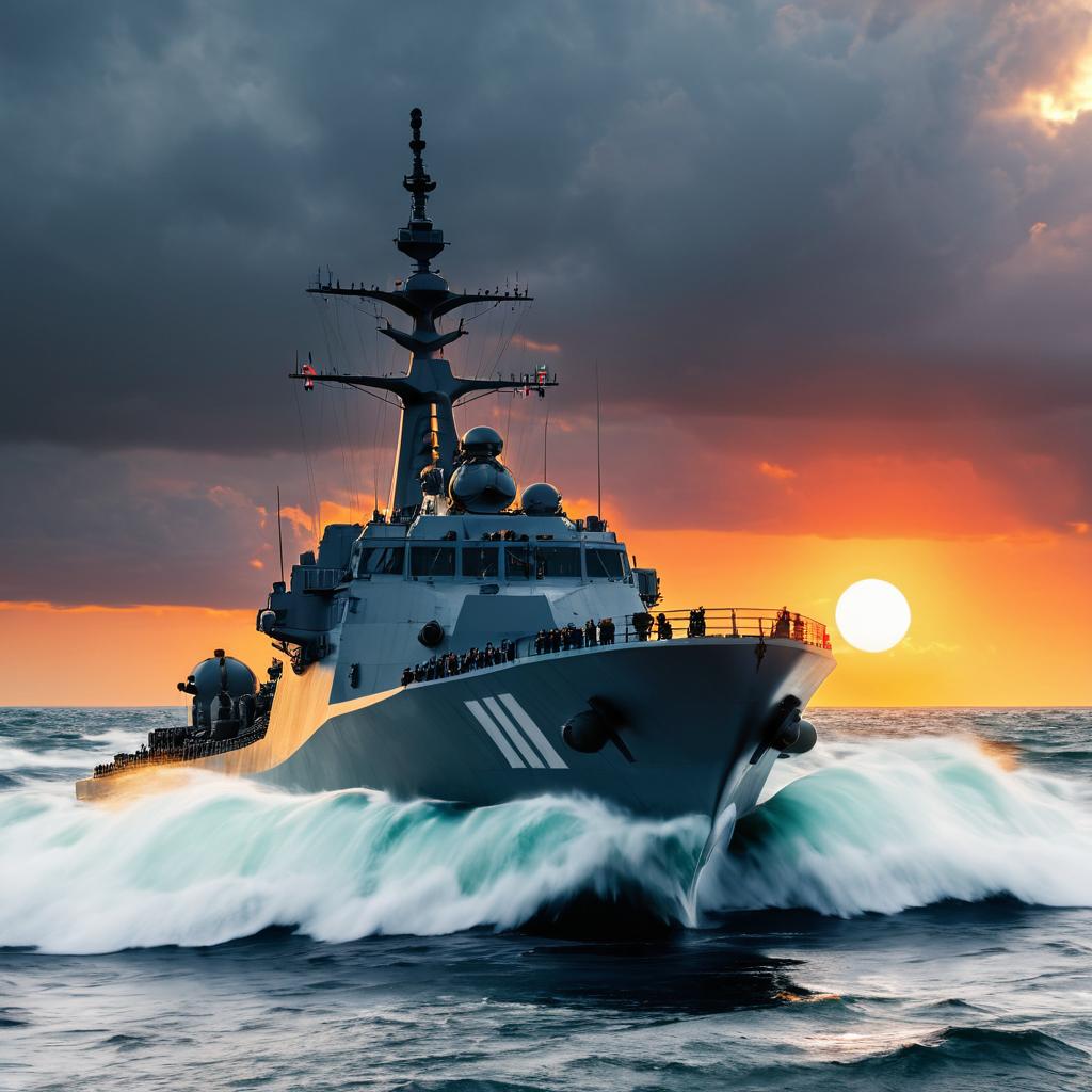 A naval warship with the hull number 141 speeds through the ocean creating a large wake, under a dramatic sky with dense clouds and a warm sunset glow. Crew members can be seen on deck, with the ship's radar and communication antennae visible on the mast.