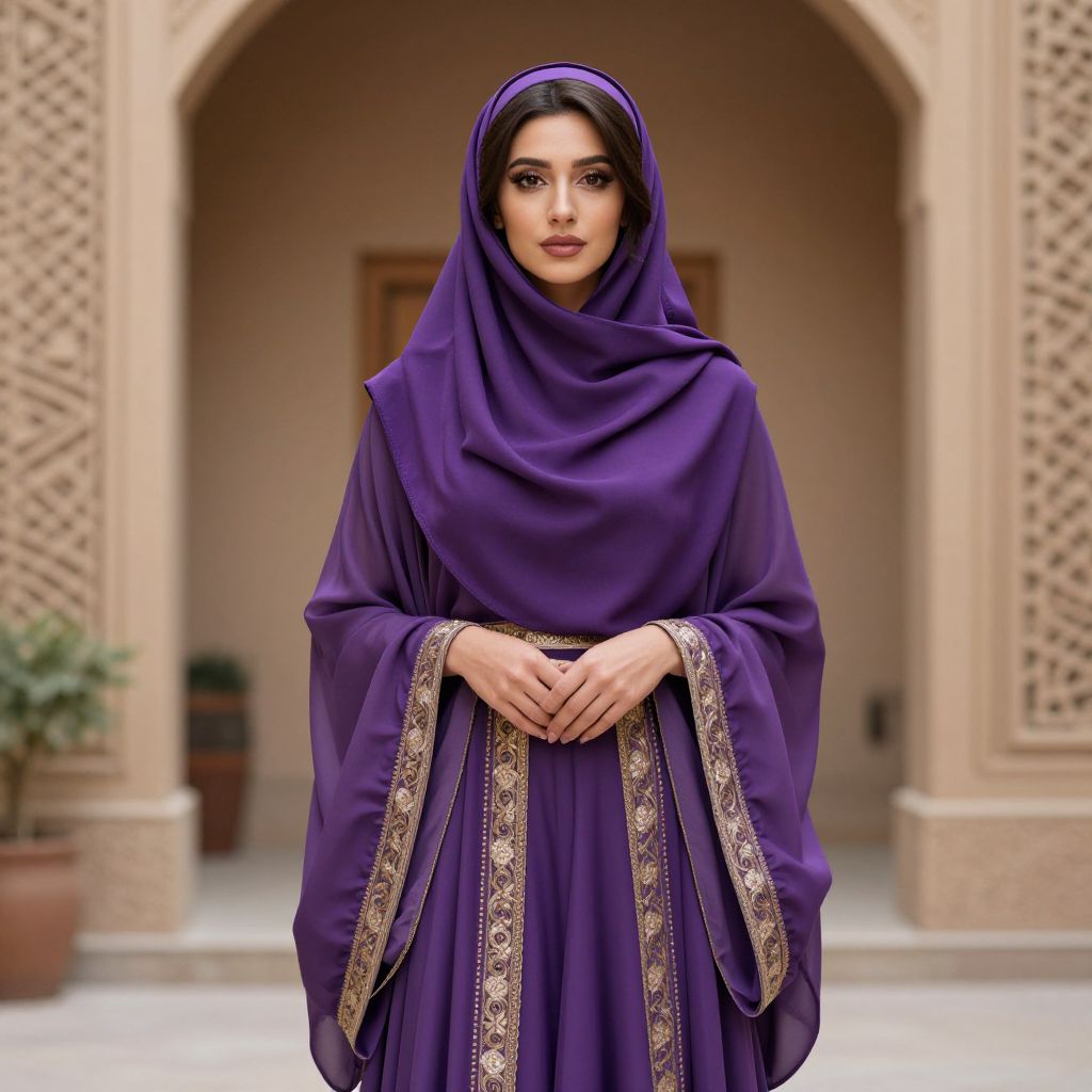 Photograph of a beautiful South Asian woman with fair skin, dark eyes, and black hair, wearing a purple hijab and traditional embroidered dress, standing