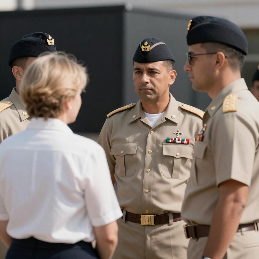 Photograph of a bearded man with a medium build, wearing a dark green military-style uniform and cap, standing behind a wooden podium with eight microphones. He looks to the right with a serious expression. The background includes a blurred flag and a large, cylindrical structure. Bright daylight illuminates the scene.