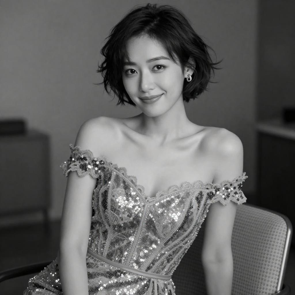 Asian woman with short, dark hair, wearing a black, sleeveless top, leaning against a ured, blue-lit wall. Her right arm is raised, hand gripping the wall. Blue lighting highlights her intense expression. The background has geometric patterns.