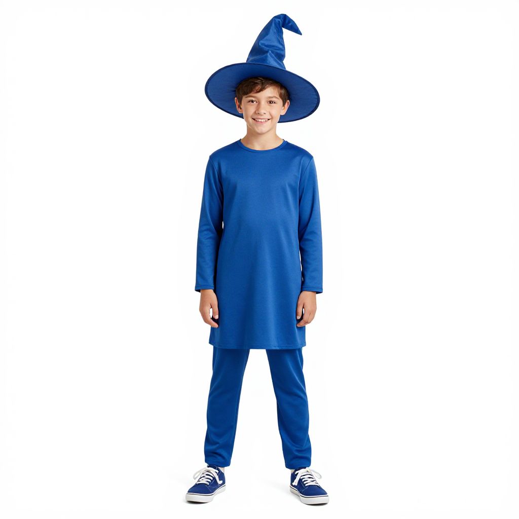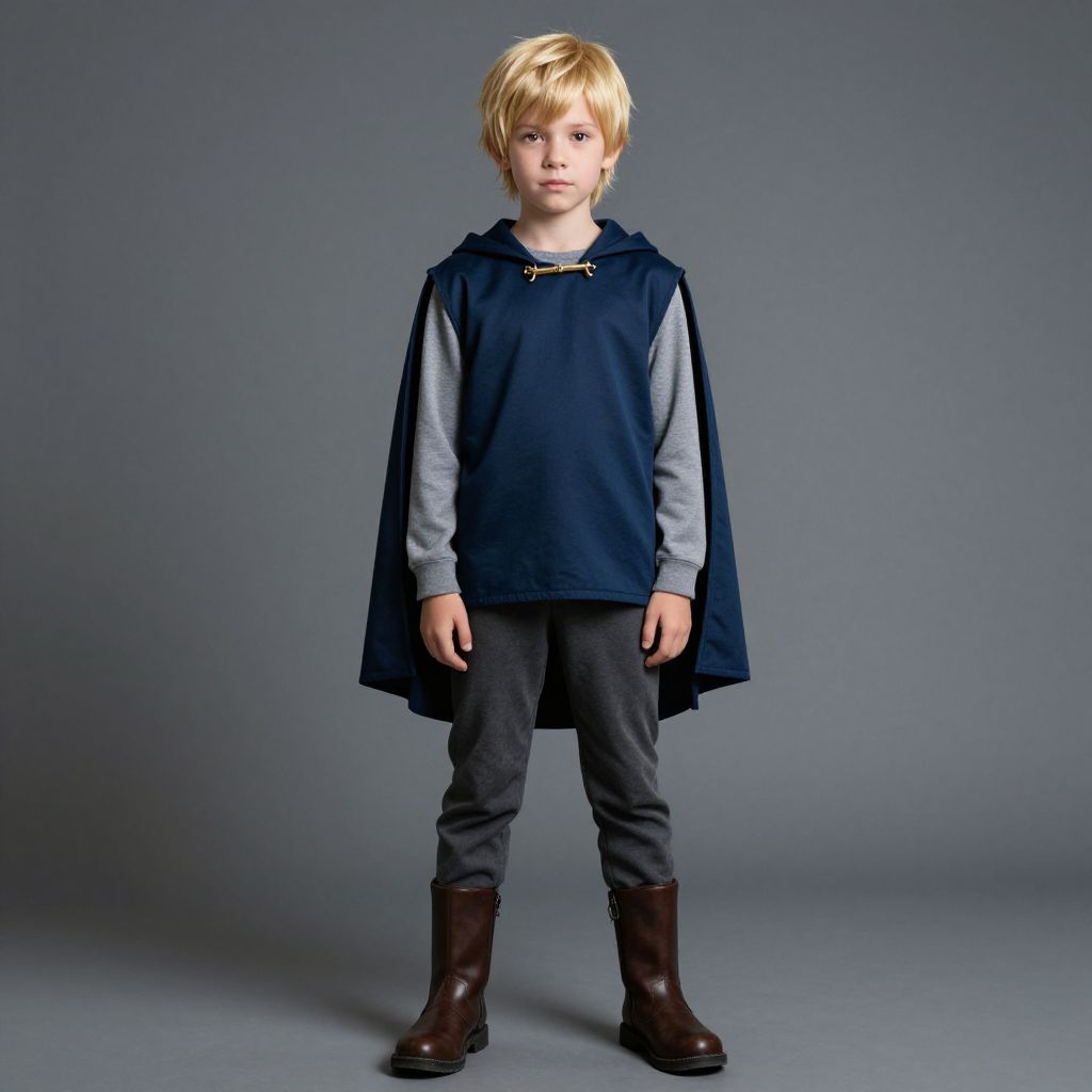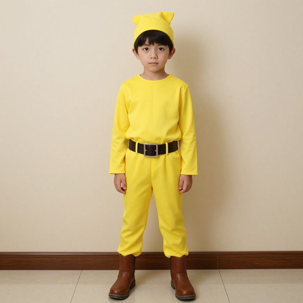 Photograph of a young boy with short brown hair, wearing a bright yellow superhero costume, cape, pants, belt, and white sneakers, standing confidently