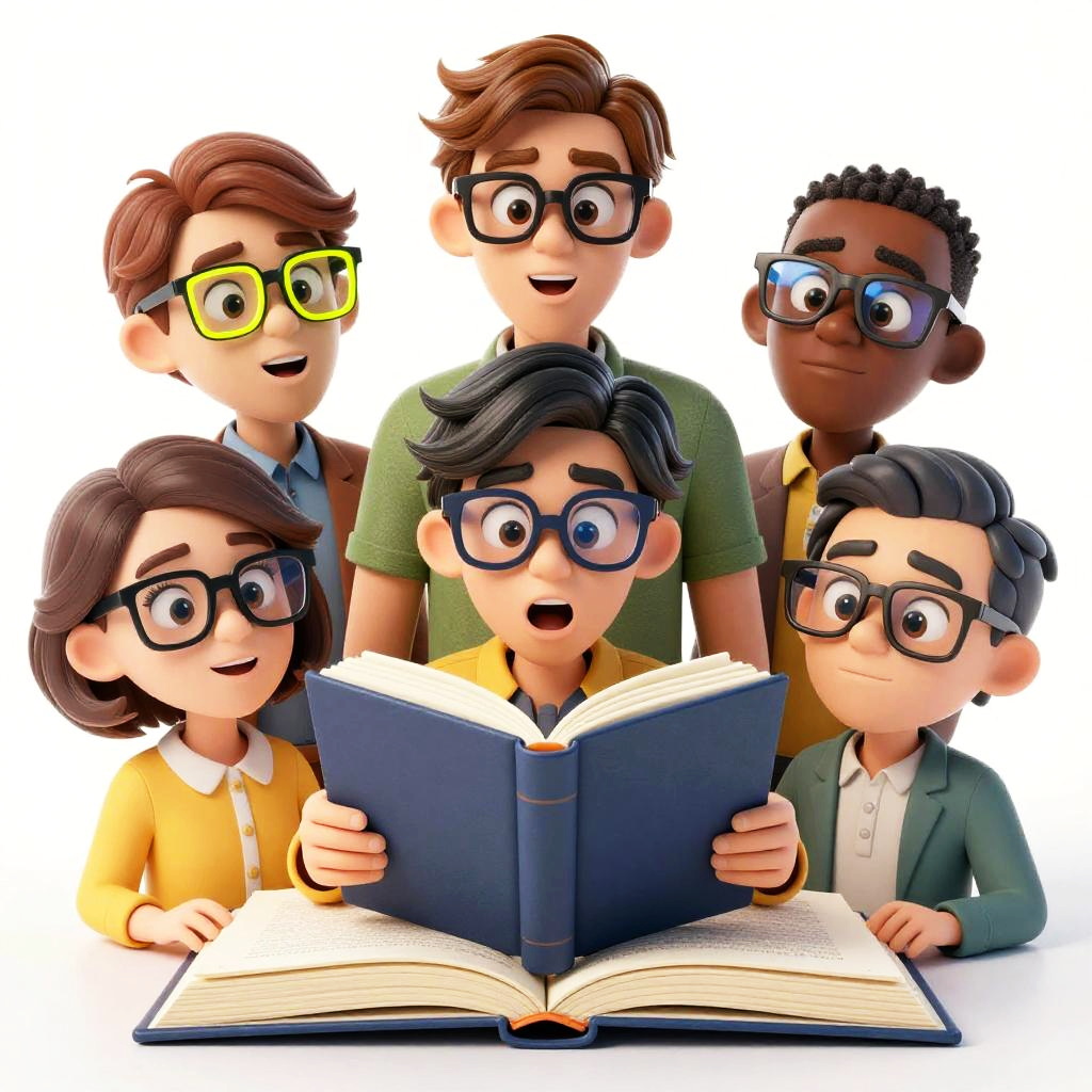 Reading glasses funny comic-style scene where a group of diverse characters all wear dramatically different silly reading glasses, from neon frames to mismatched lenses, gathered around a giant book, each reacting differently with exaggerated expressions.