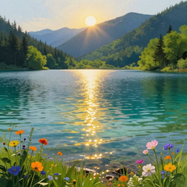 A vibrant, surreal landscape painting featuring a radiant yellow sun reflecting on a tranquil lake. The scene includes stylized twisting cypress trees and golden reeds by the water's edge, with swirling patterns in the sky and water enhancing the dreamlike atmosphere.