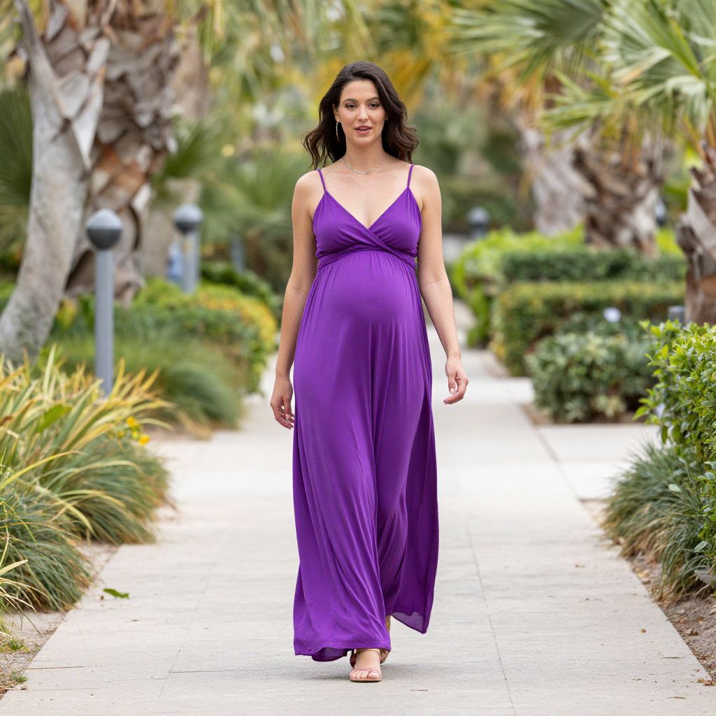 Woman wearing a vibrant purple maxi maternity dress strolls gracefully down a palm-lined pathway, surrounded by lush greenery and manicured hedges.