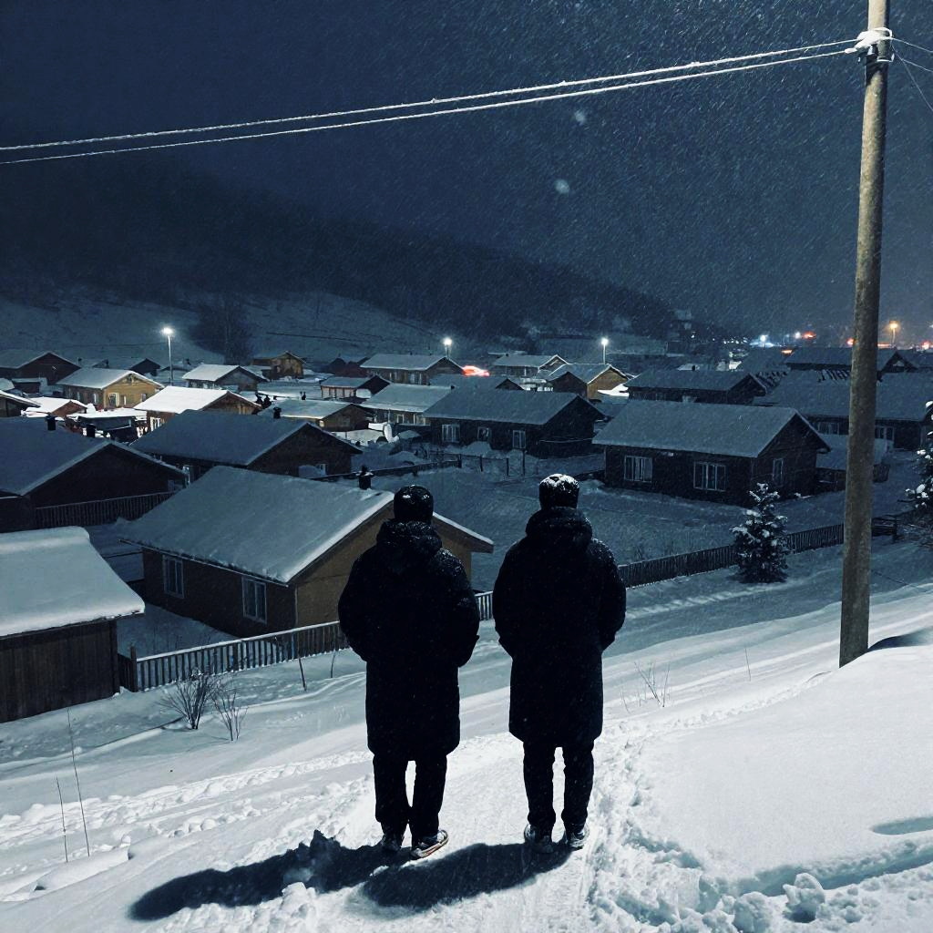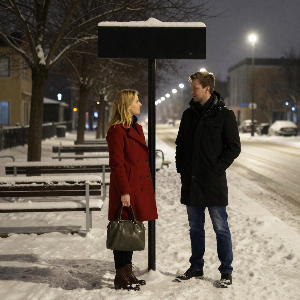 Nighttime photograph of a snowy outdoor Christmas market. Four people stand near a large tree, surrounded by decorated benches, small trees, and string lights. Snow-covered ground, candy cane decoration in background. Two men and one woman in front, one man to the right. Casual winter clothing. Warm, festive lighting.