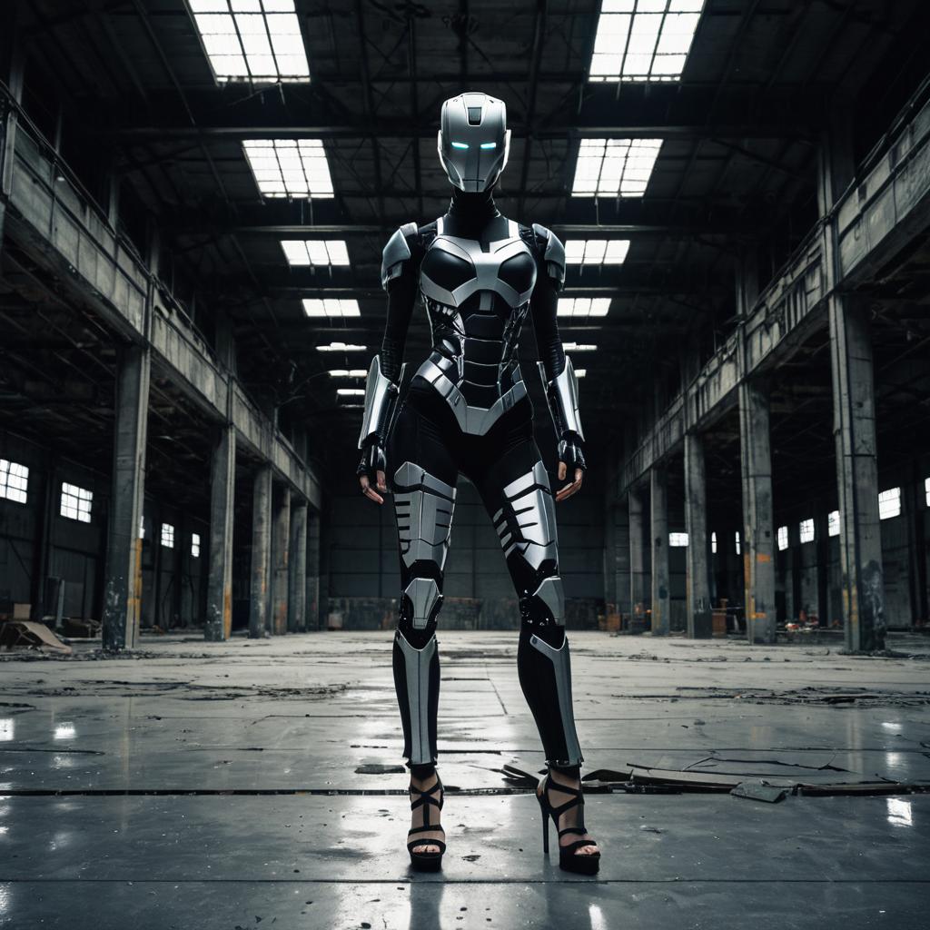 Sleek humanoid robot in abandoned industrial warehouse at dusk, wearing matte black armored bodysuit with silver circuit-like patterns and balconette neckline, metallic combat boots, cracked concrete floor beneath, flickering overhead industrial lamps, cinematic wide-angle editorial shot, hyper-detailed CGI render.