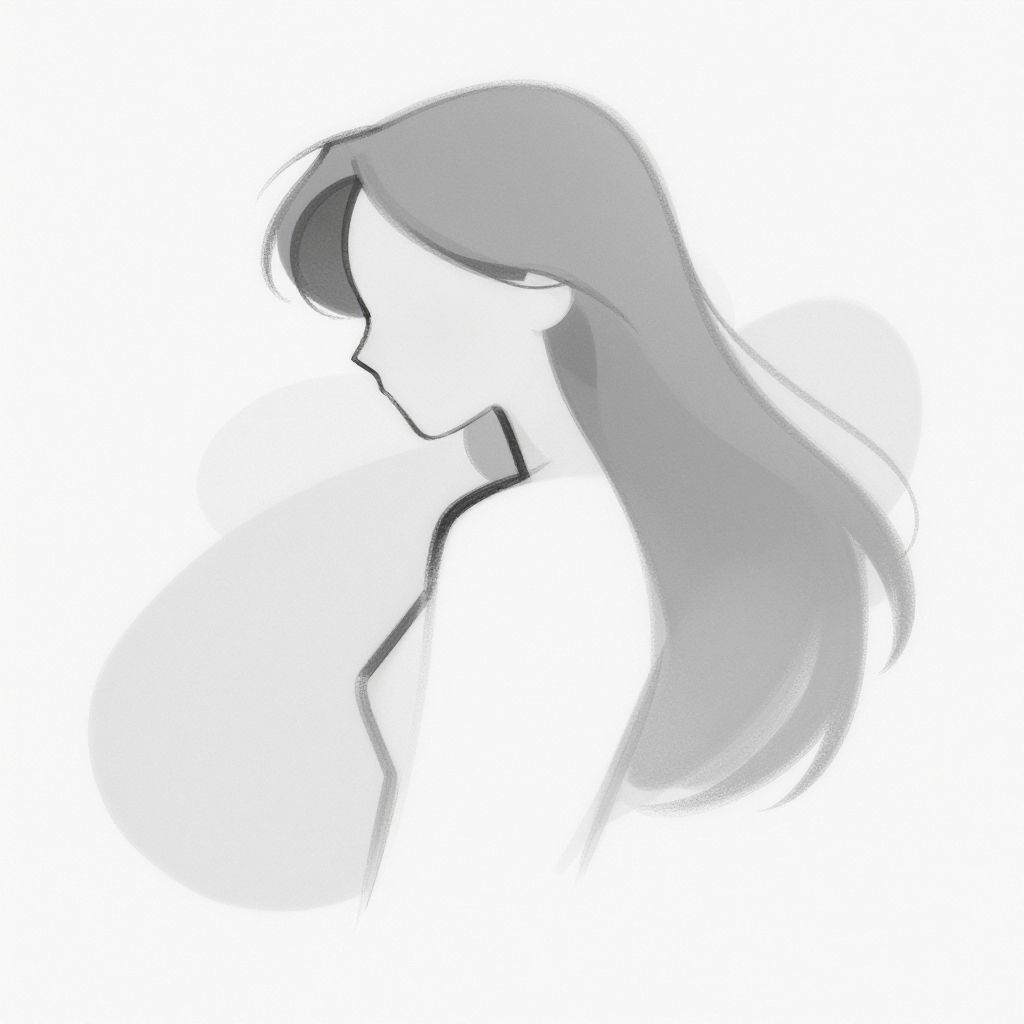 This is a black and white digital line drawing of a young woman with a side profile, facing left. She has long, flowing hair styled in a thick braid that falls over her right shoulder. Her large, expressive eyes are looking slightly upward, and she has a calm, gentle expression on her face. The drawing is minimalist, with clean, thin lines and no shading or background details, focusing solely on the character. Her shoulders are bare, suggesting she might be wearing a strapless garment. The overall style is simple and elegant, capturing a sense of innocence and grace.