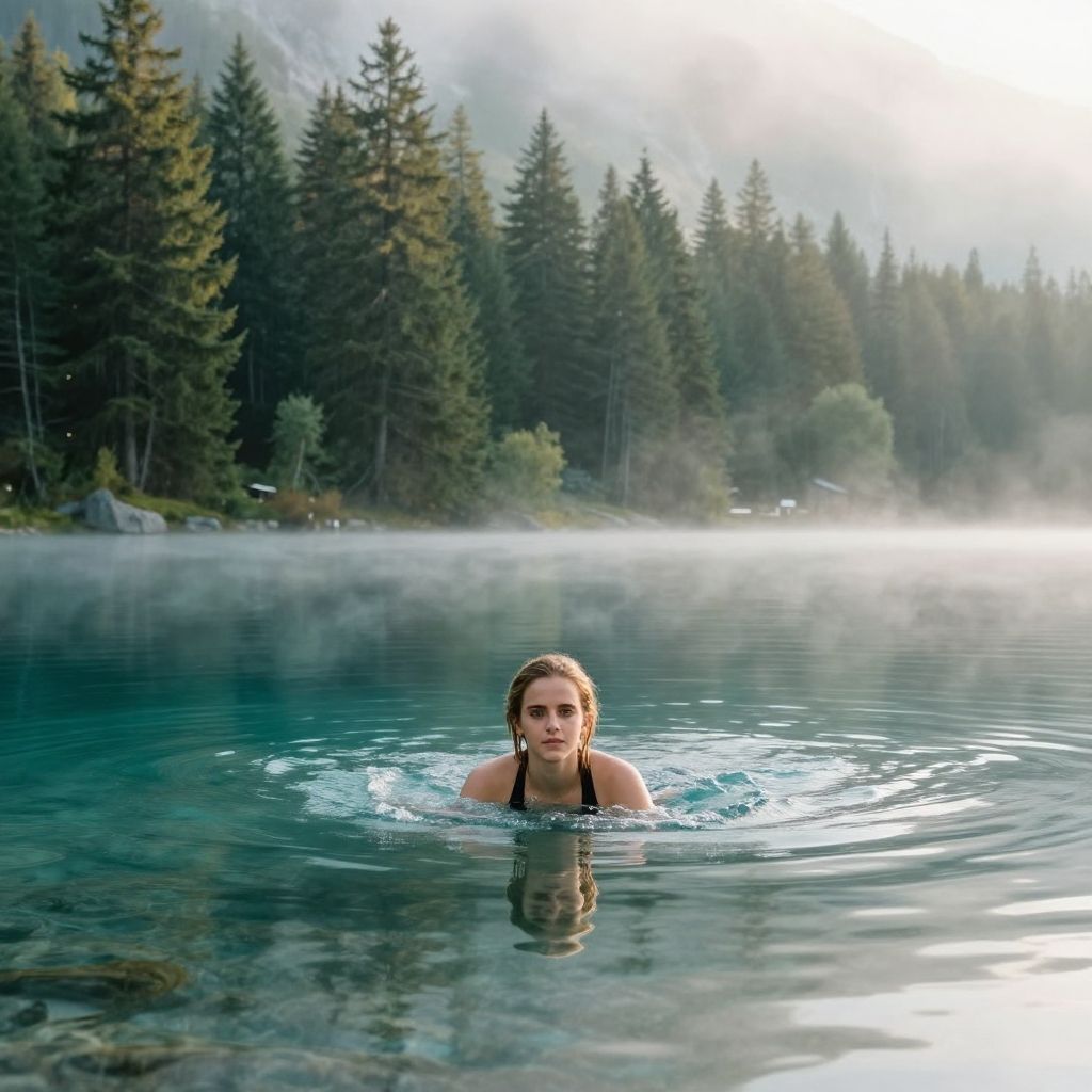 Emma Watson swim in a serene mountain lake with crystal clear water, surrounded by lush pine trees and mist, early morning light creating a tranquil and dreamy environment