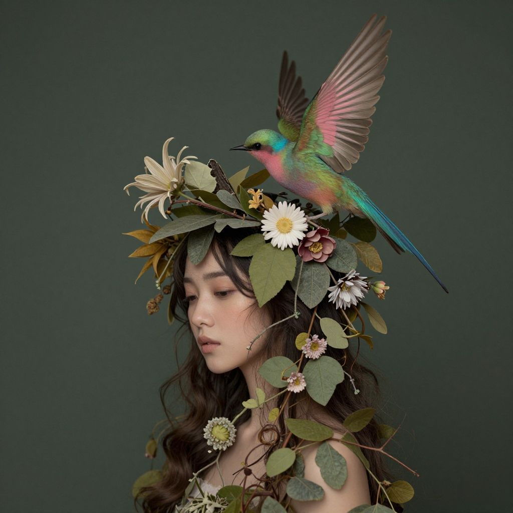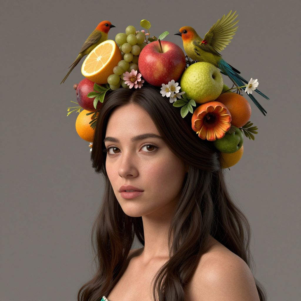 Photograph of a young woman with long, dark hair, wearing a vibrant fruit and bird crown, featuring apples, grapes, birds, and flowers,