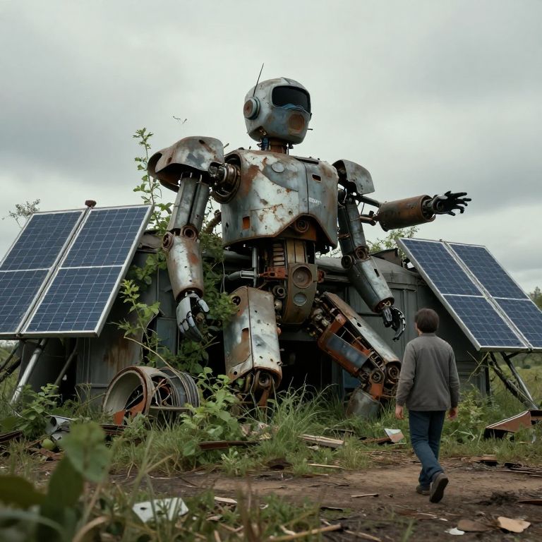 Automat in a post-apocalyptic world repurposed with scavenged metal parts and solar panels, overgrown vegetation creeping through cracks, solitary figure approaching with cautious hope, moody lighting and highly textured environment conveying resilience and survival