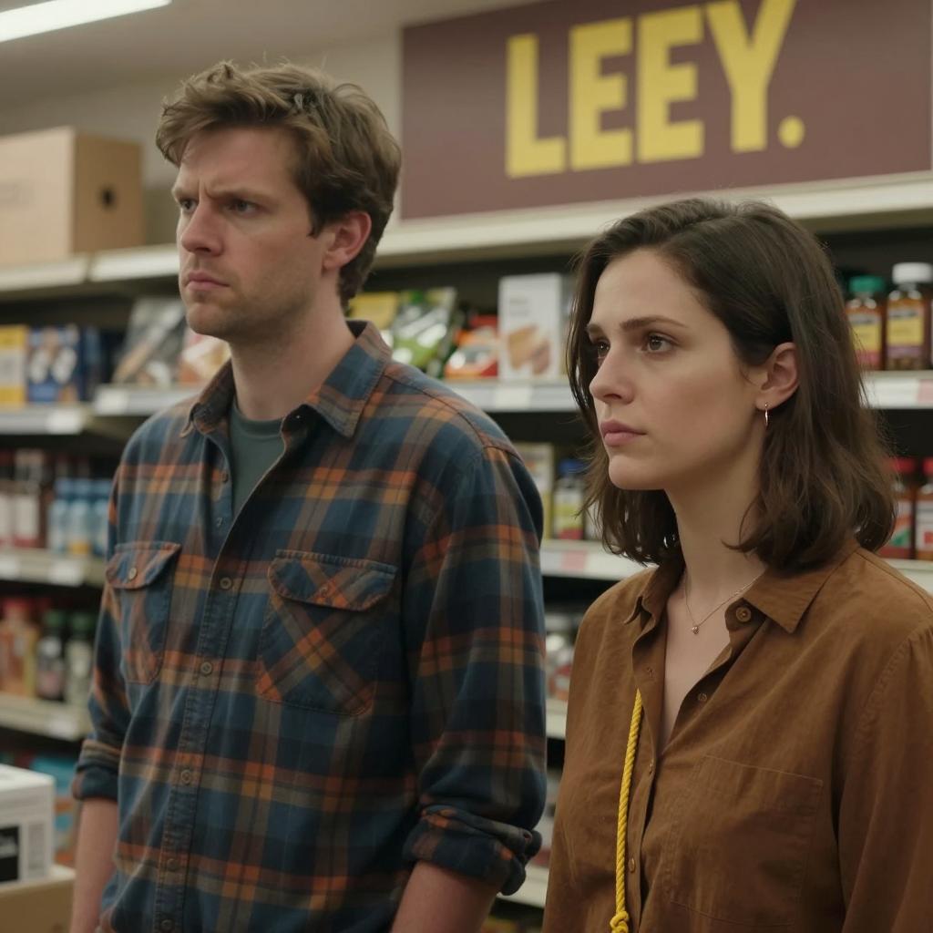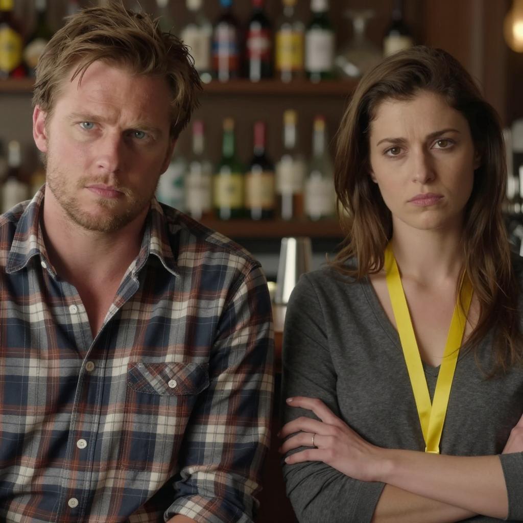 Photograph of two people in a bar setting. Male on left, brown hair, plaid shirt, medium build, intense gaze. Female on right, brown hair, gray shirt, yellow lanyard, arms crossed, neutral expression. Background includes blurred bar decor.