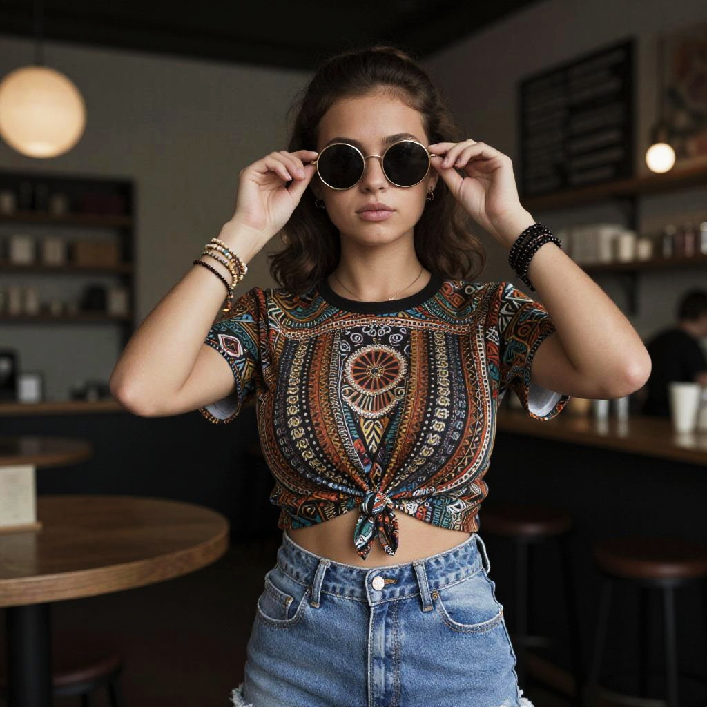 A willowy woman in a cropped ethnic print tee and high-waisted denim shorts, oversized round sunglasses perched on her nose, layered beaded bracelets adorning her wrists, stands in a trendy coffee bar in a historic building, captured in the soft, nostalgic tones of daguerreotype film. Sexy. Pretty face and beаutiful eyes. Big breasts