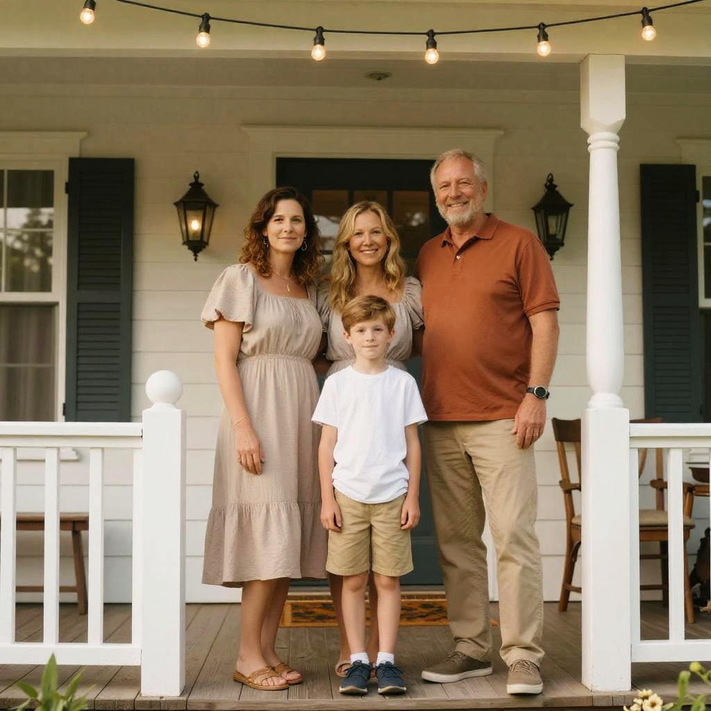 A warm and casual family portrait of three people standing on a white wooden porch of a cozy house. The atmosphere is relaxed and friendly with natural warm lighting. The setting includes soft, muted colors and warm earth tones such as beige and burnt orange, with string lights overhead adding a homely touch.
