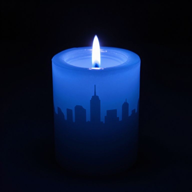 A solitary candle glows with a brilliant blue flame, its wax etched with the silhouette of a bustling city skyline, casting an ethereal glow over a dark, textured surface that defies the boundaries of reality.