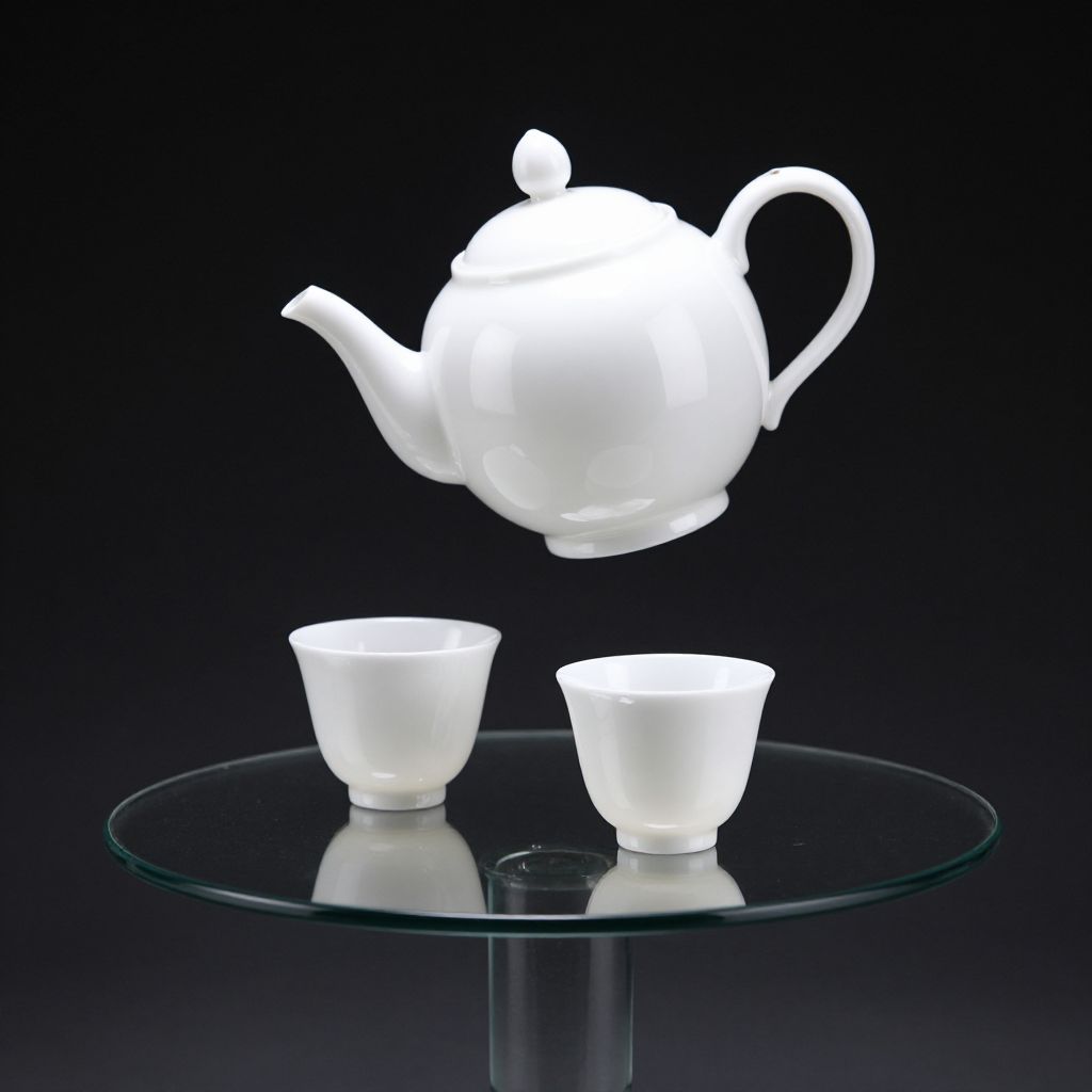 Elegant white porcelain teapot and two matching cups hover gracefully above a reflective glass pedestal, creating an illusion of weightlessness against a dark background.