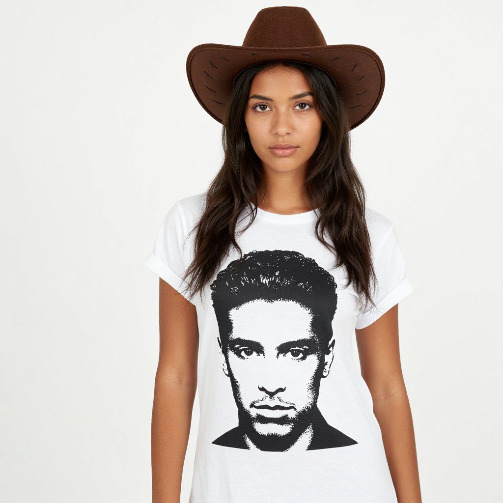 Photograph of a young woman with medium brown skin and long, wavy black hair. She wears a brown cowboy hat and a white t-shirt with a black, high-contrast portrait of a man's face centered on the chest. The background is plain white, making her the focal point. She has a neutral expression and stands facing the camera. The t-shirt's graphic is reminiscent of pop art style, with bold black and white contrasts. The hat's texture appears soft and slightly curved. The overall style is casual and modern.