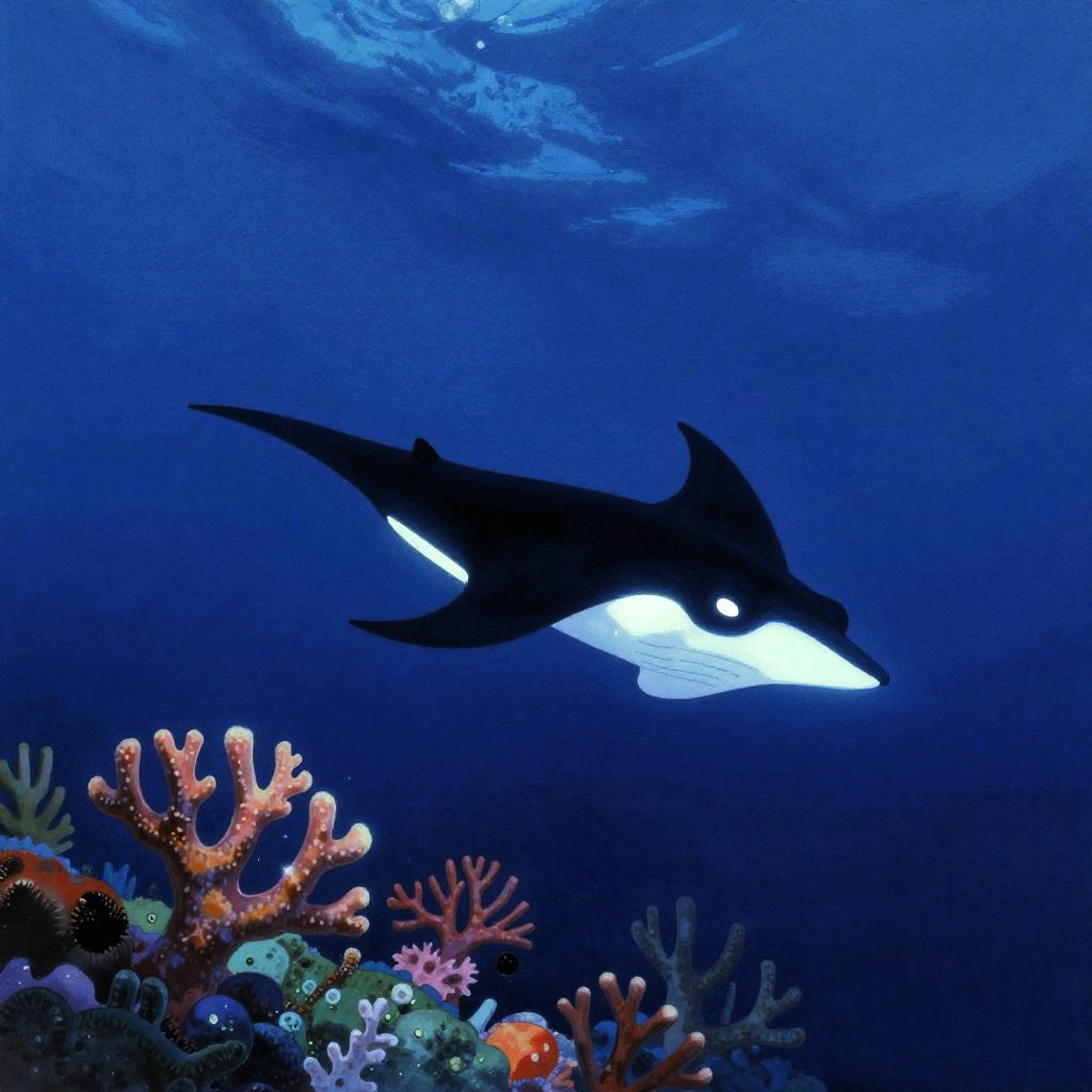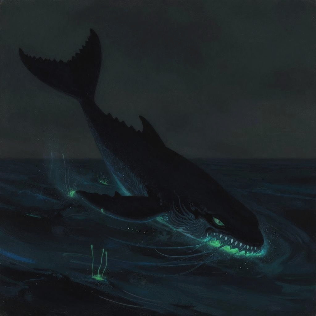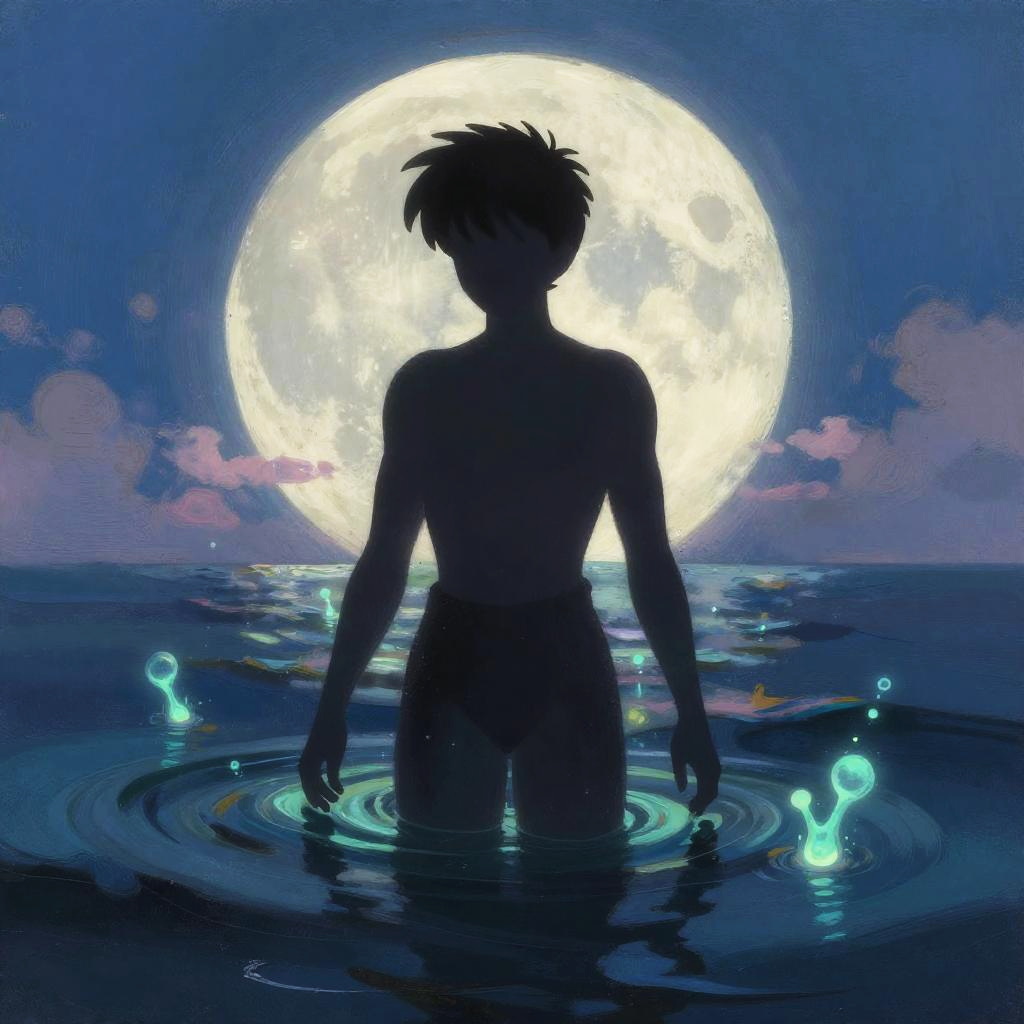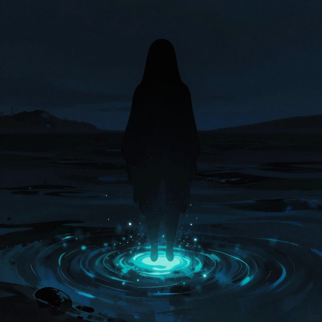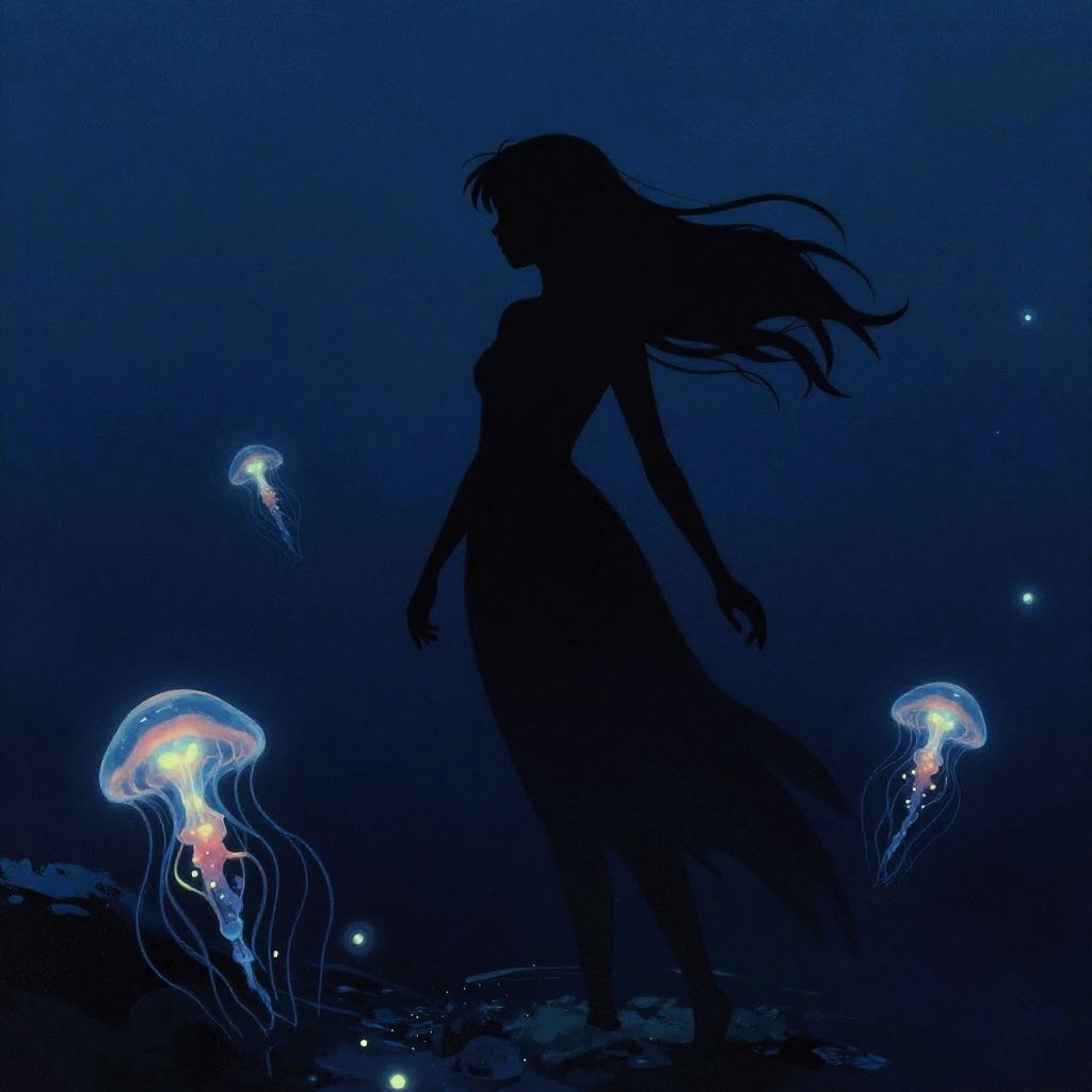 Silhouette of a ghostly mariner in a twilight ocean, illuminated by bioluminescent algae, limited monochrome navy with cyan highlights, painterly impressionist style, inspired by Yoshitaka Amano and Moebius