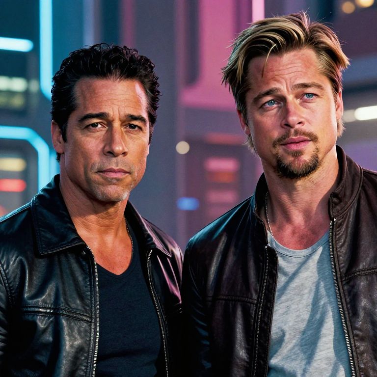 Benicio Del Toro and Brad Pitt as action heroes, futuristic urban setting, dramatic shadows, vibrant colors, cinematic composition, high contrast, realistic facial details