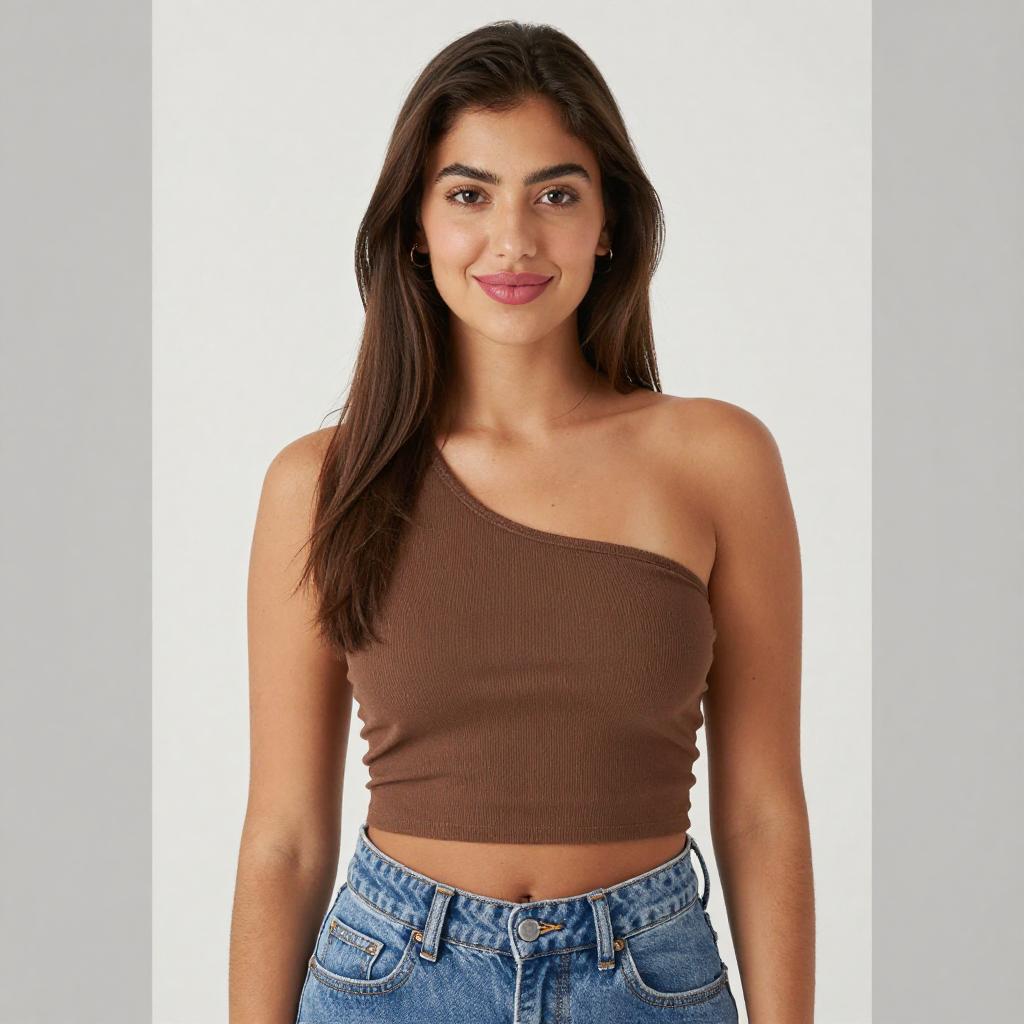 Photograph of a young woman with long, straight brown hair and tan skin. She's wearing a ribbed, brown, one-shoulder crop top that shows a hint of her left breast and high-waisted blue jeans. She has full lips with pink lipstick, dark eyebrows, and a subtle, confident smile. The background is a bright white vertical strip with gray on the sides.