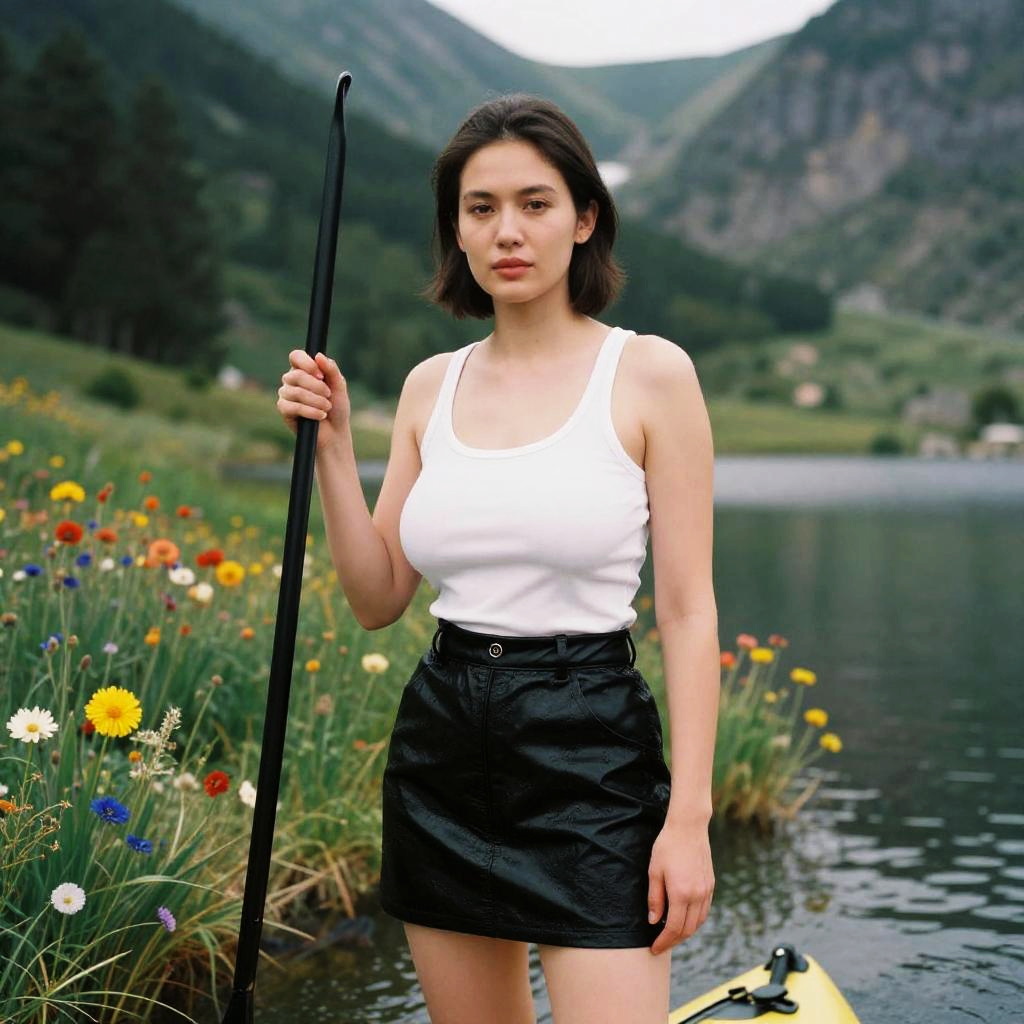 A athletic woman in a minimalist white tank top and black faux leather skirt, styled in technicolor analog film stock, kayaking on a serene mountain lake surrounded by wildflowers. Sexy. Pretty face and beаutiful eyes. Big breasts