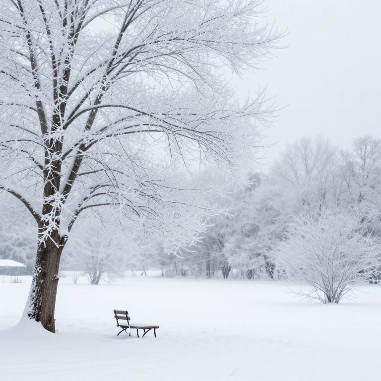 Photograph of a serene winter scene featuring a snow-covered landscape. A large, leafless tree stands on the left, its branches heavily coated in white snow. In the background, another tree and a bush are similarly snow-laden. A solitary wooden bench is positioned in the mid-ground, slightly to the right of the tree. The ground is entirely blanketed in white snow, creating a soft, smooth texture. The sky is overcast, adding to the overall white and gray color palette. The scene exudes a quiet, peaceful atmosphere.