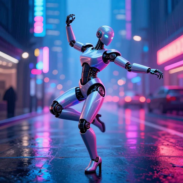 Curvy robot dancing gracefully on a neon-lit street, sleek reflective armor with luminous accents, rain-soaked pavement reflecting city lights, dynamic motion blur, vibrant color palette, modern sci-fi style painting.