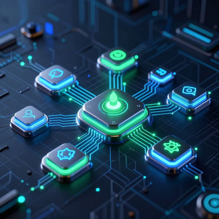 A highly detailed CGI image of six glowing, square, futuristic circuit blocks with LED lights on a dark, circuit-board background. Each block has a distinct symbol: a central block with a green LED, two blue and two cyan LEDs surrounding it. The blocks are connected by blue neon lines, illuminating the board. The background is dark with intricate, finely detailed circuitry. The scene has a cybernetic, high-tech aesthetic with vibrant neon colors contrasting the dark backdrop.