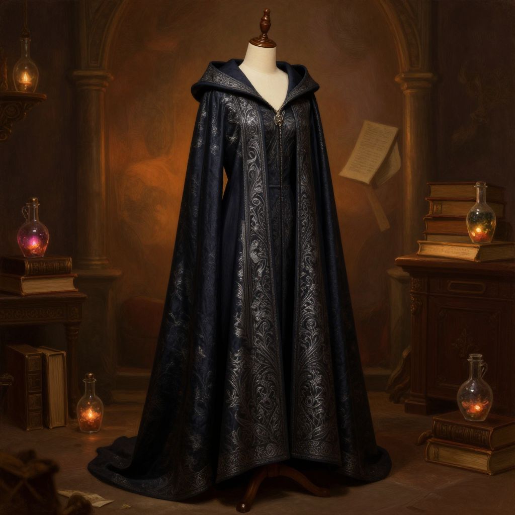 Elegant hooded D&D cloak with deep folds and intricate silver patterns, displayed on a wooden mannequin in an ancient wizard's chamber filled with spellbooks and glowing potions, warm ambient light, painterly fantasy style