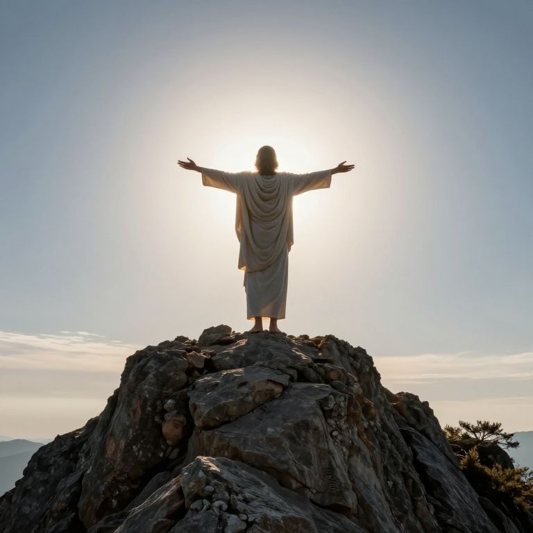 Radiant light pierces the heavens as a figure stands atop a rocky peak, arms outstretched in a gesture of divine embrace, symbolizing the eternal quest for spiritual liberation and the transcendence of earthly limitations.