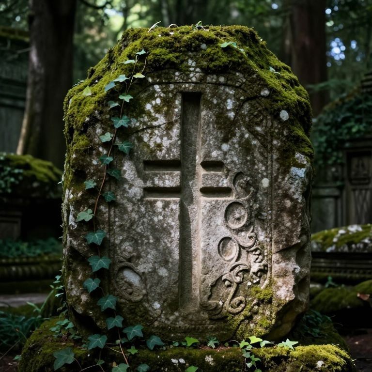 Photograph of a moss-covered stone tomb in a dimly lit forest. The tombstone features a weathered, carved cross in the center, surrounded by intricate circular and floral carvings. Ivy vines with dark green leaves partially wrap around the stone, adding to its aged appearance. Sunlight filters through the dense canopy above, casting dappled light and shadows on the tomb. The background includes blurred, tall trees and a wooden fence, enhancing the eerie, mystical atmosphere. The stone's texture is rough and uneven, with patches of white lichen.