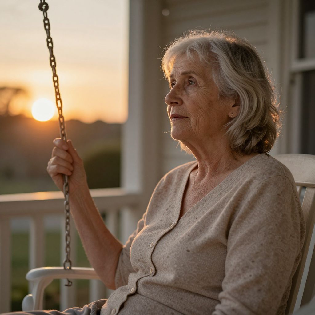 An elderly woman with silver hair and gentle, knowing eyes sitting on a porch swing, quietly watching the sunset, her lips slightly parted in a moment of peaceful reflection, capturing an expressive moment of quiet wisdom and emotional depth, warm golden tones, natural outdoor setting