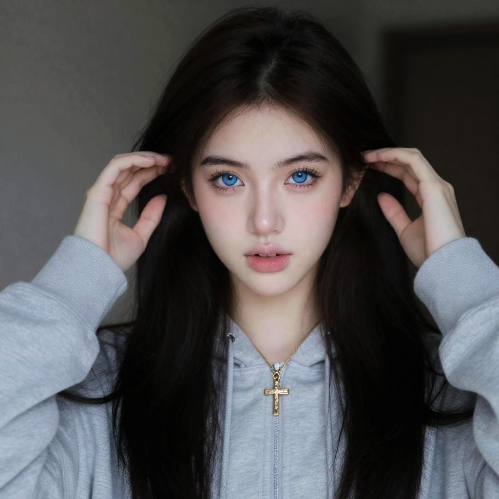 Photograph of a young woman with pale skin and long dark brown hair, intense blue eyes, and slightly parted lips. She wears a light gray hoodie with a gold cross necklace. Her hands touch her hair. Dark background with soft light on the left.
