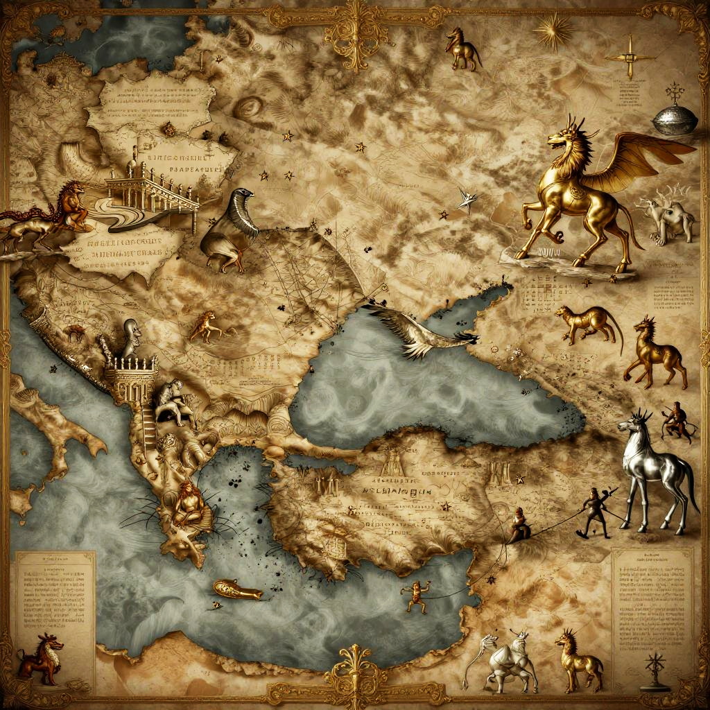 Map of Alexander's empire illustrated as a fantasy map, with mythical creatures, ancient scripts, and highlighted key battles, sepia tones with gold accents, richly textured