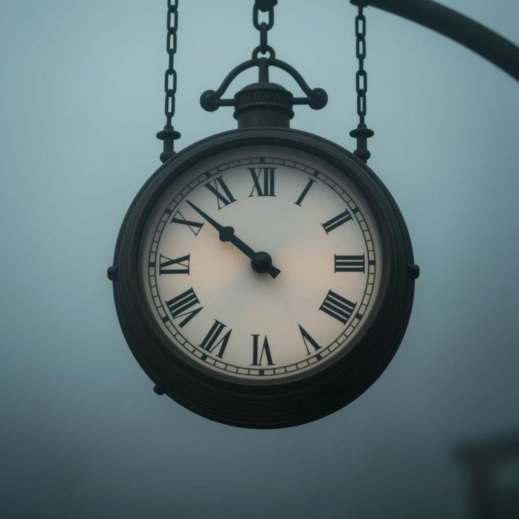 A vintage-style round clock hanging from chains, featuring Roman numerals on its white face. The clock is set against a misty, muted blue-grey background, emphasizing its antique metal frame and romantic, timeless atmosphere. The black clock hands indicate the time as nearly 10:53. The image conveys a haunting, surreal mood with a subtle cyberpunk-inspired aesthetic.