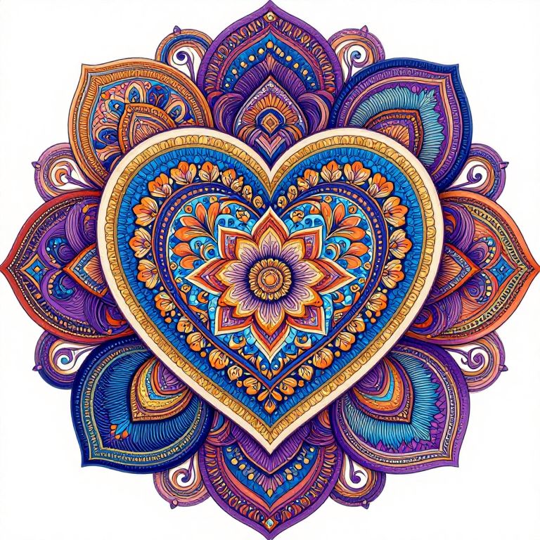 Vibrant, intricate mandala design featuring a large blue and orange heart with floral patterns, surrounded by detailed, multicolored petals and swirls
