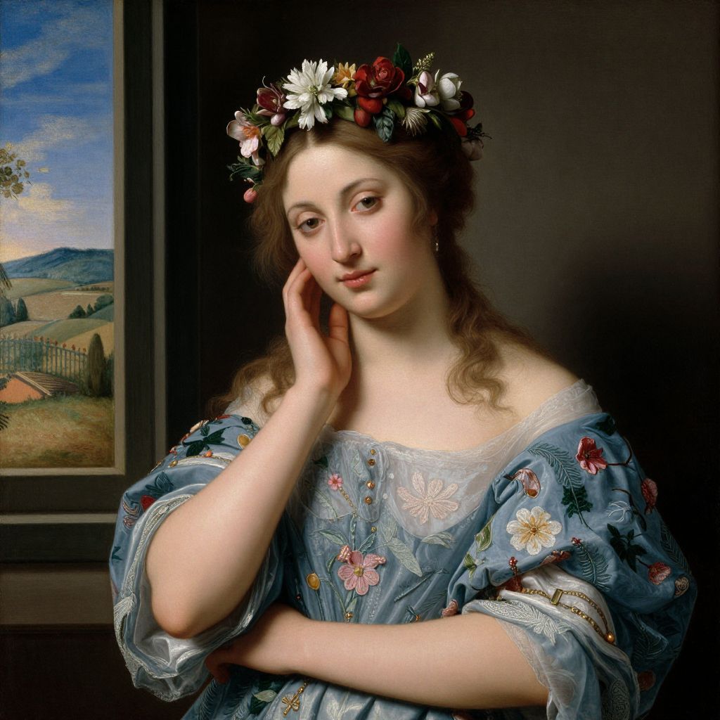 Giandomenico Tiepolo's *Allegorical Portrait of a Young Woman as Flora* (1780-90) depicts a serene young woman adorned with a floral crown, wearing a delicate blue dress embellished with embroidered flowers, her hand gently touching her cheek, set against a darkened interior with a vibrant outdoor landscape visible through a window.