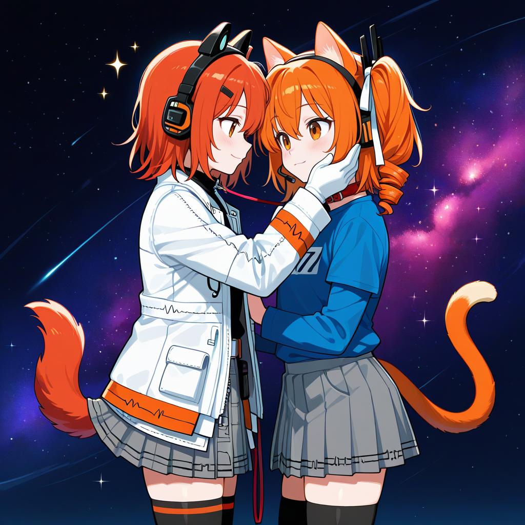 Cowboy shot, adachi rei, kemonomimi mode, 2girls, face-to-face, orange hair, red hair, orange eyes, red eyes, cat ears, dog ears, cat tail, drill hair, twin drills, smile, blush, :3, sparkle, black shirt, blue shirt, pleated skirt, miniskirt, white ribbon, headphones, white gloves, black thighhighs, collar, holding leash, hand on another's cheek, fearful, space nebula, sequined jacket, futuristic headset