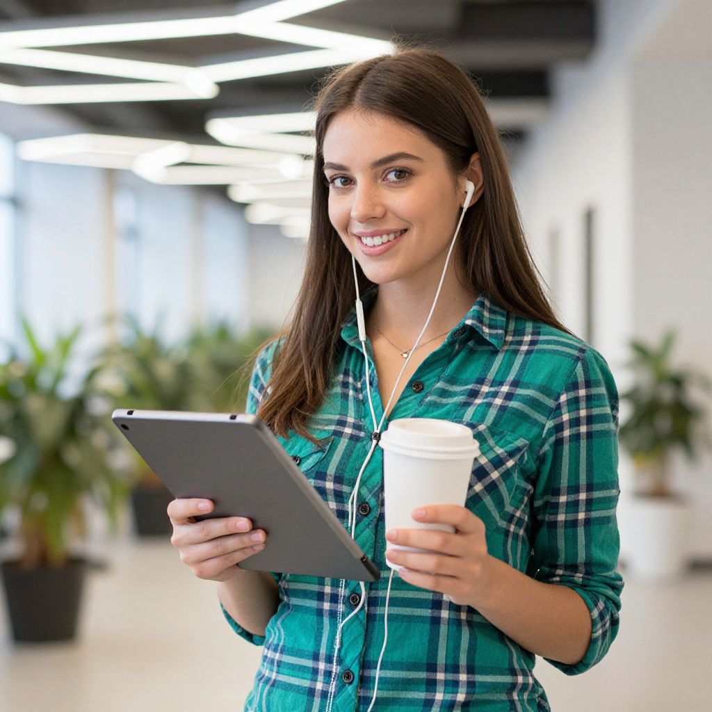 Photograph of a smiling young woman with long brown hair, wearing a green plaid shirt, holding a black tablet and a white coffee cup. She's standing in a modern, brightly lit office hallway with geometric ceiling lights and potted plants in the background. She's also wearing white earphones, and her expression is friendly and relaxed.