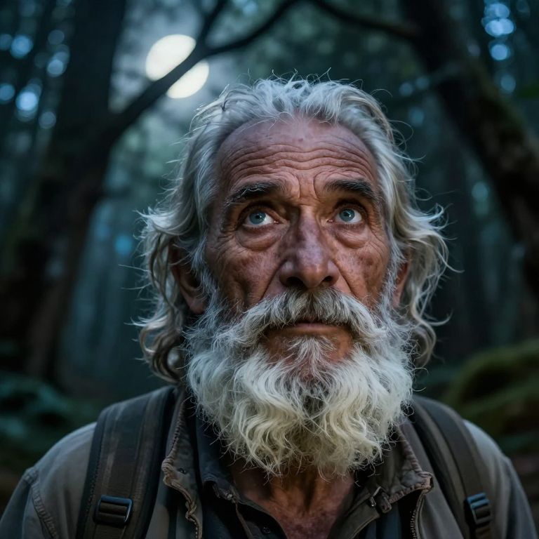 A portrait photograph showcasing a seasoned traveler with a rugged countenance, twinkling eyes, and a flowing white beard. Set against the mystical forest backdrop bathed in ethereal moonlight filtering through gnarled branches, his expression reflects a lifetime of adventures. From an unconventional eye-level perspective directly above, we're drawn into this captivating scene, evoking introspection as one wonders about the stories behind the etched lines on this wise traveler's face.
