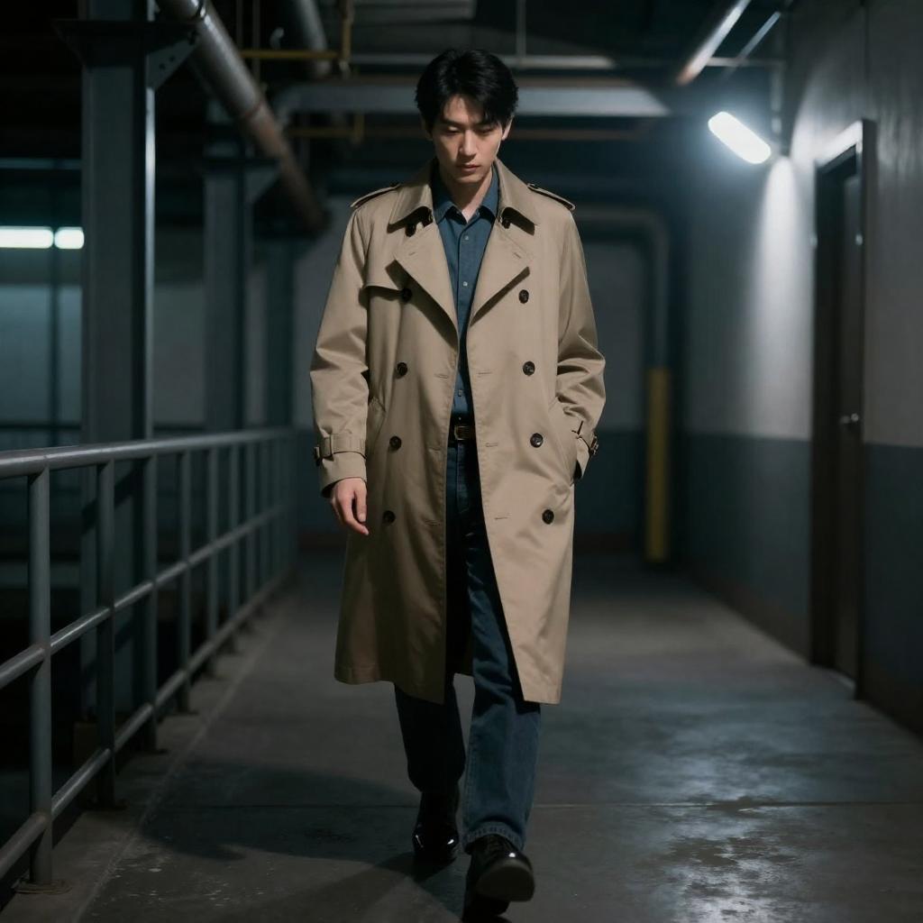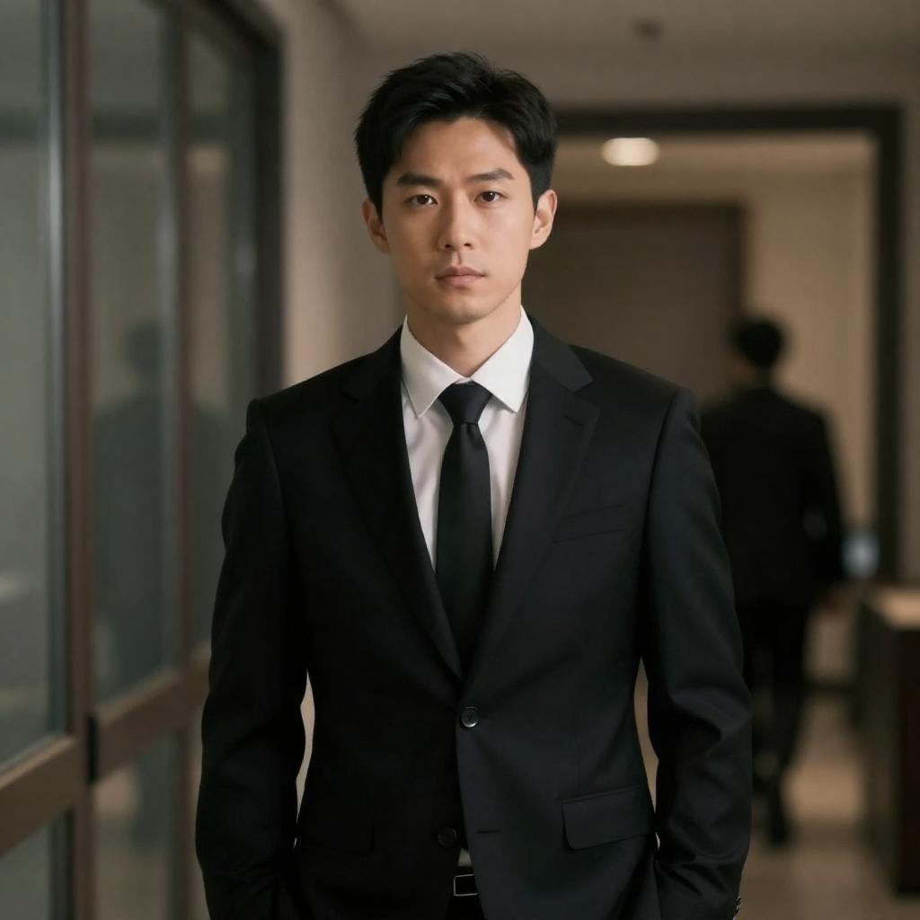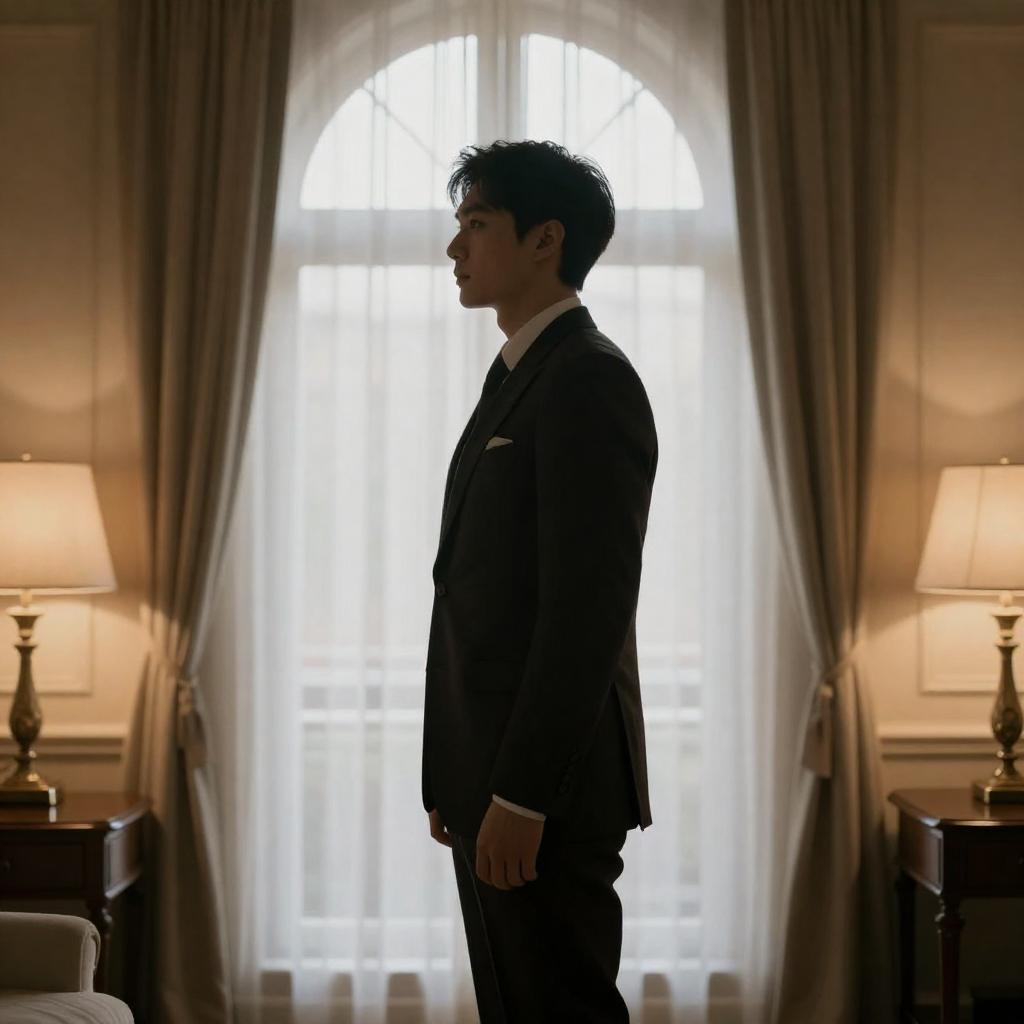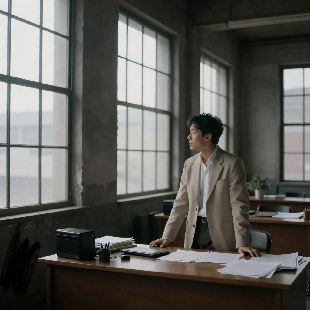 Photograph of a man in a beige suit standing at a cluttered desk in a dimly lit, industrial room with large windows. He looks out the window, hands on the desk. The background includes a tall, dark pillar and scattered papers. The left side has abstract black and white brushstrokes.